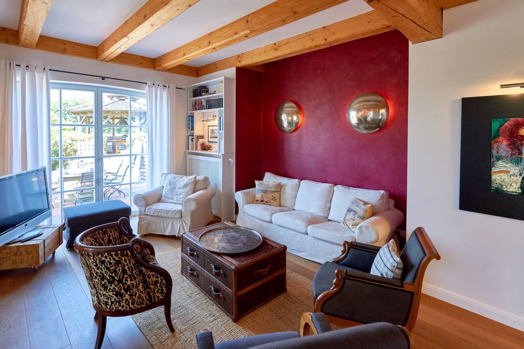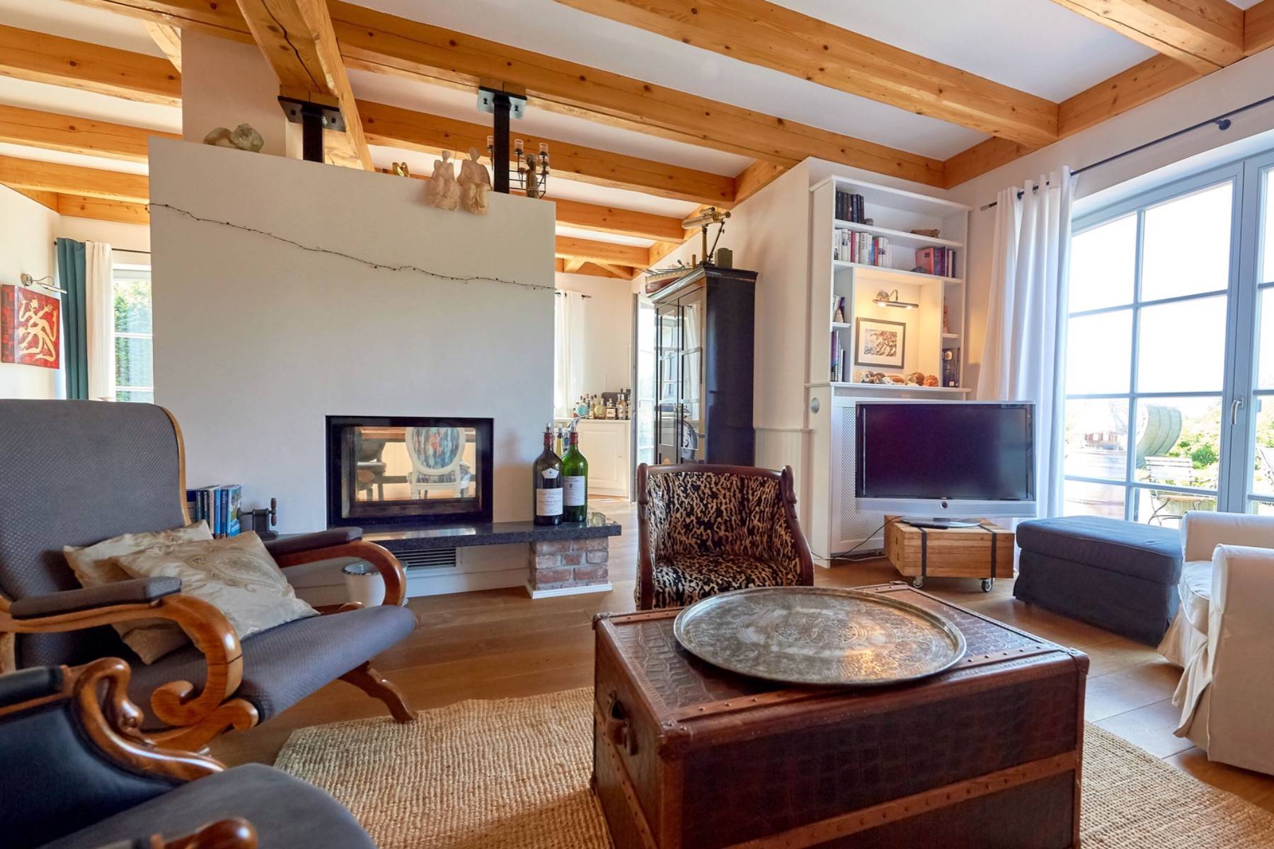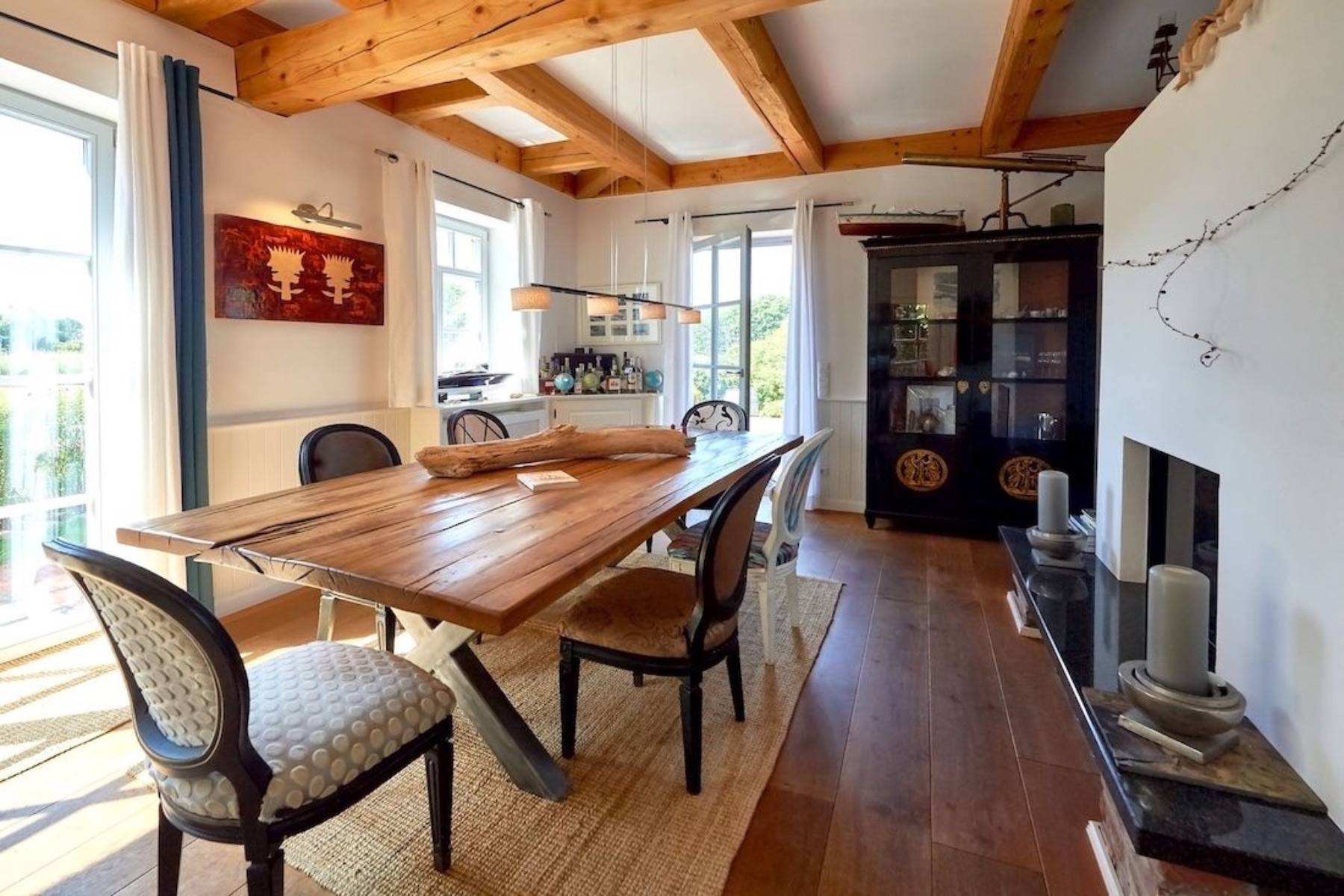 Das ca. 50 m² große Wohn-/Esszimmer mit der angrenzenden offenen Küche (auch mit einer stilvollen Schiebetür verschließbar) besticht durch die großzügigen Ausmaße unter gemütlichen Holzbalken und den Kamin. Der Wohnbereich mit der bequemen Couch und den 4 Sesseln in verschiedenen Stilrichtungen wirkt durch eine wunderschöne rot-gewachste Wand besonders edel und ist durch den 2-seitig-verglasten Kamin als Raummittelpunkt optisch vom Esszimmerbereich getrennt. Kaminholz ist ebenso vorhanden wie eine Stereoanlage mit CD-Player. Ein in schwarzem Schellack ausgeführter Vitrinenschrank im Empirestil bildet den Übergang zum Essbereich.