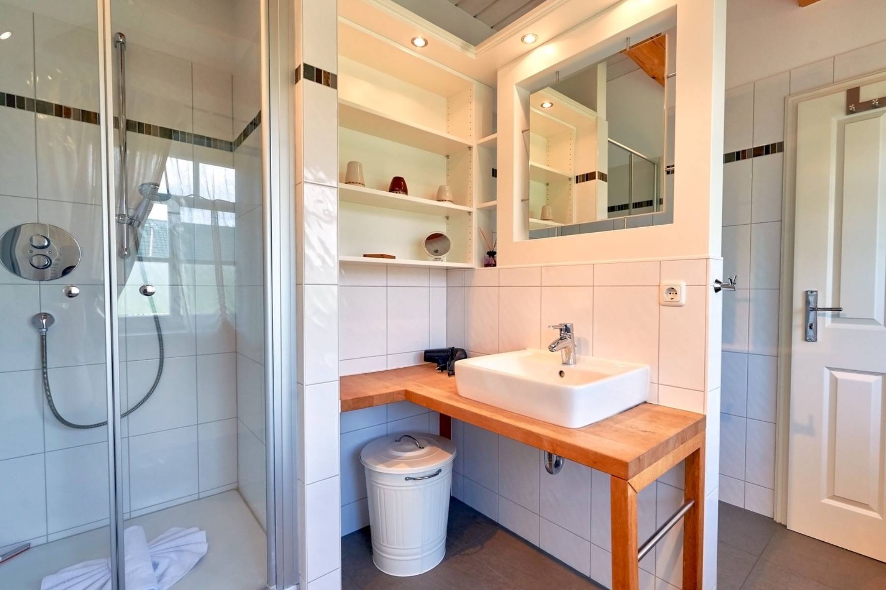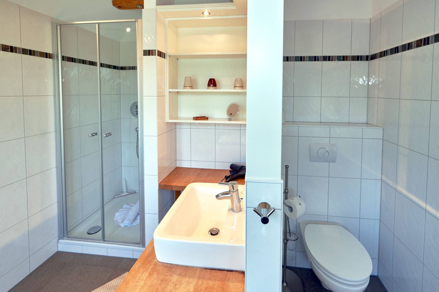 Das Haus erwartet Sie im Eingangsbereich mit einem Sekretär und einem Telefon für kostenfreie Telefonate in das dt. Festnetz und einem Garderobenschrank im Biedermeierstil. Weiterhin gibt es im Erdgeschoss (der mit echten Eichendielen ausgelegt ist) ein modernes Gäste-WC, einen Hauswirtschaftsraum mit Waschmaschine, Trockner und Tiefkühlschrank und einen "Wellnessraum" mit einer Sauna, einem Hometrainer, einer Massagedusche unter Holzbalken und einem eigenem Zugang zur Terrasse.