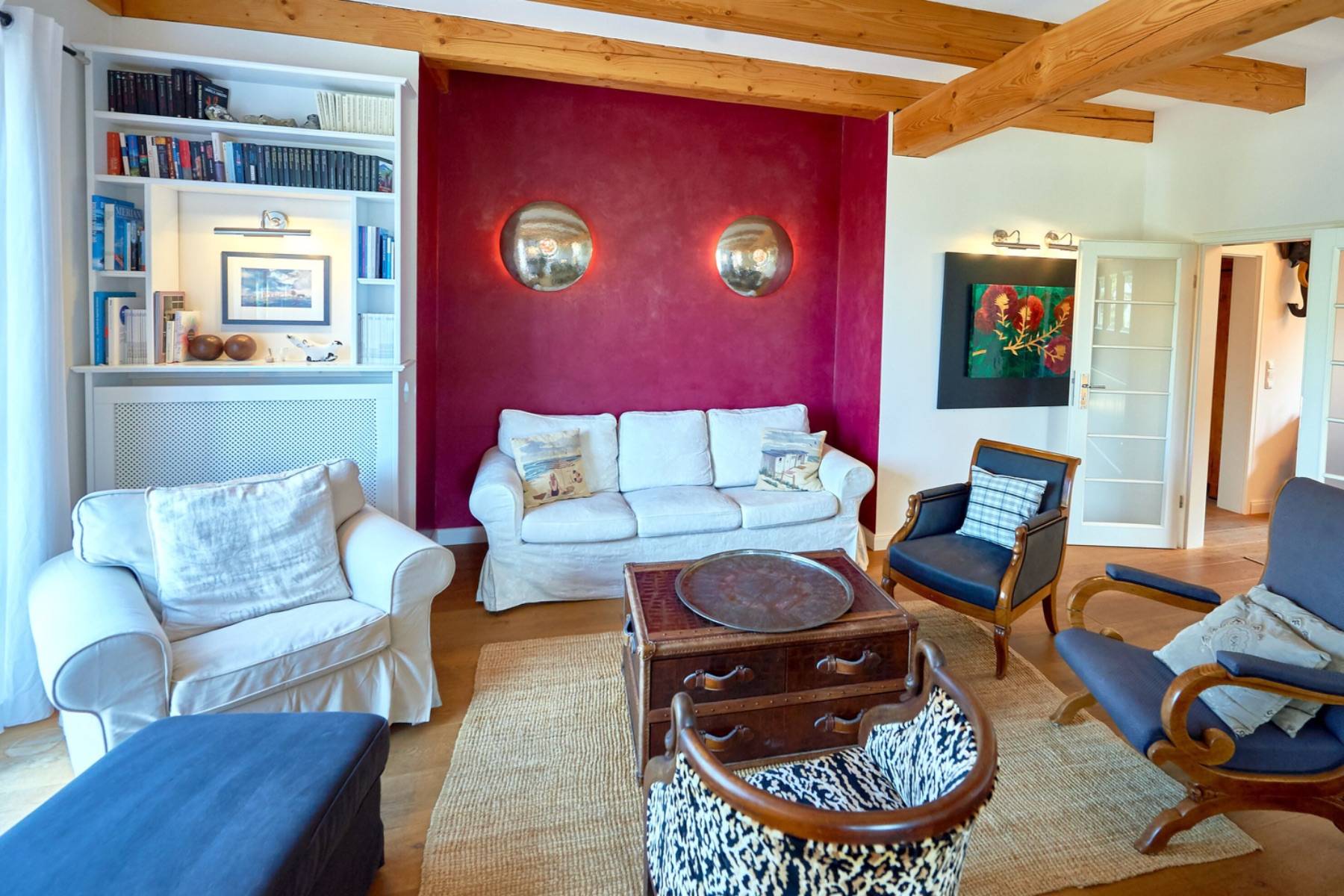Im Essbereich erwartet Sie ein großer Esstisch für 6 Personen aus urwüchsiger Mooreiche, der mit den Designerbezügen der alten Kaffeehausstühle angenehm kontrastiert. Wöchentlich steht Ihnen 1 Kiste ausgesuchter Weine aus dem Rheingau zur freien Verfügung.