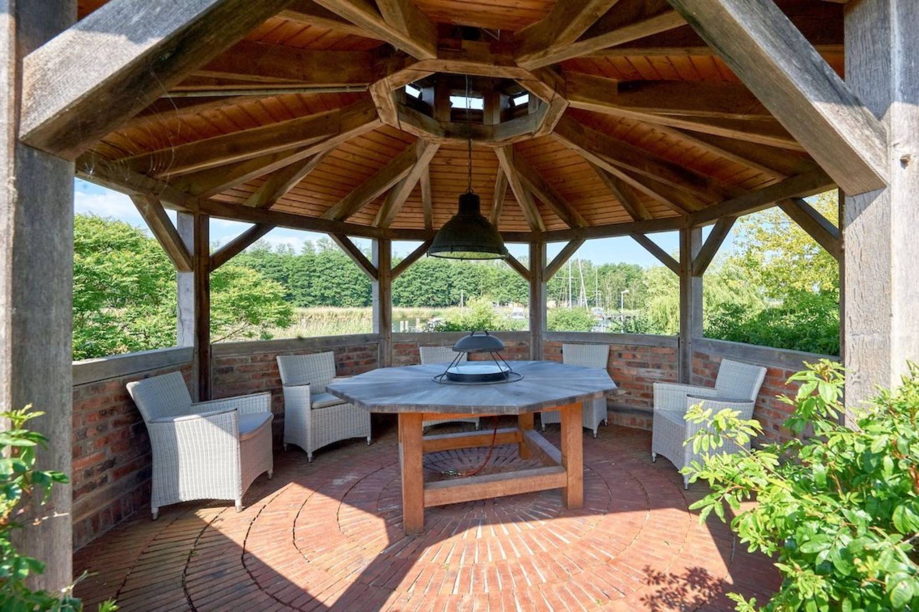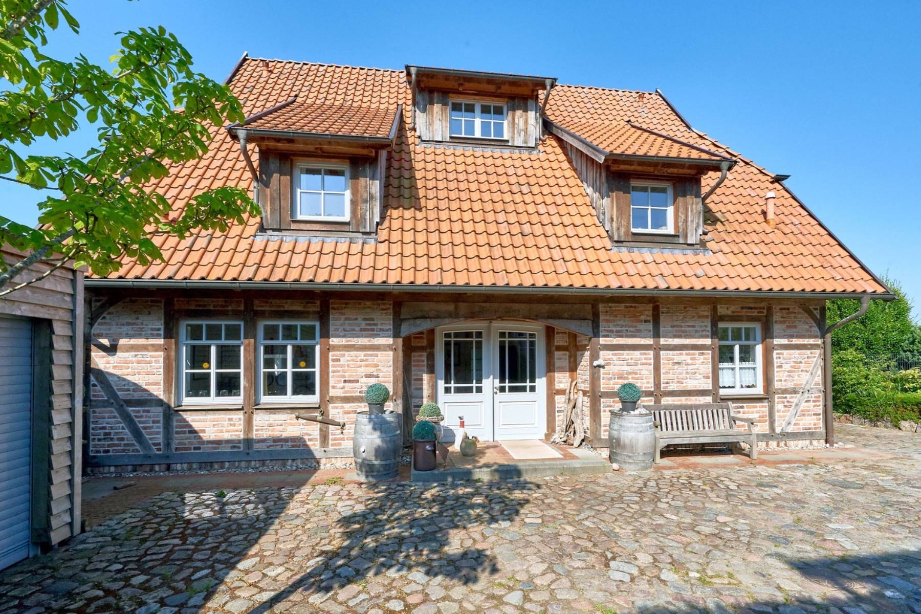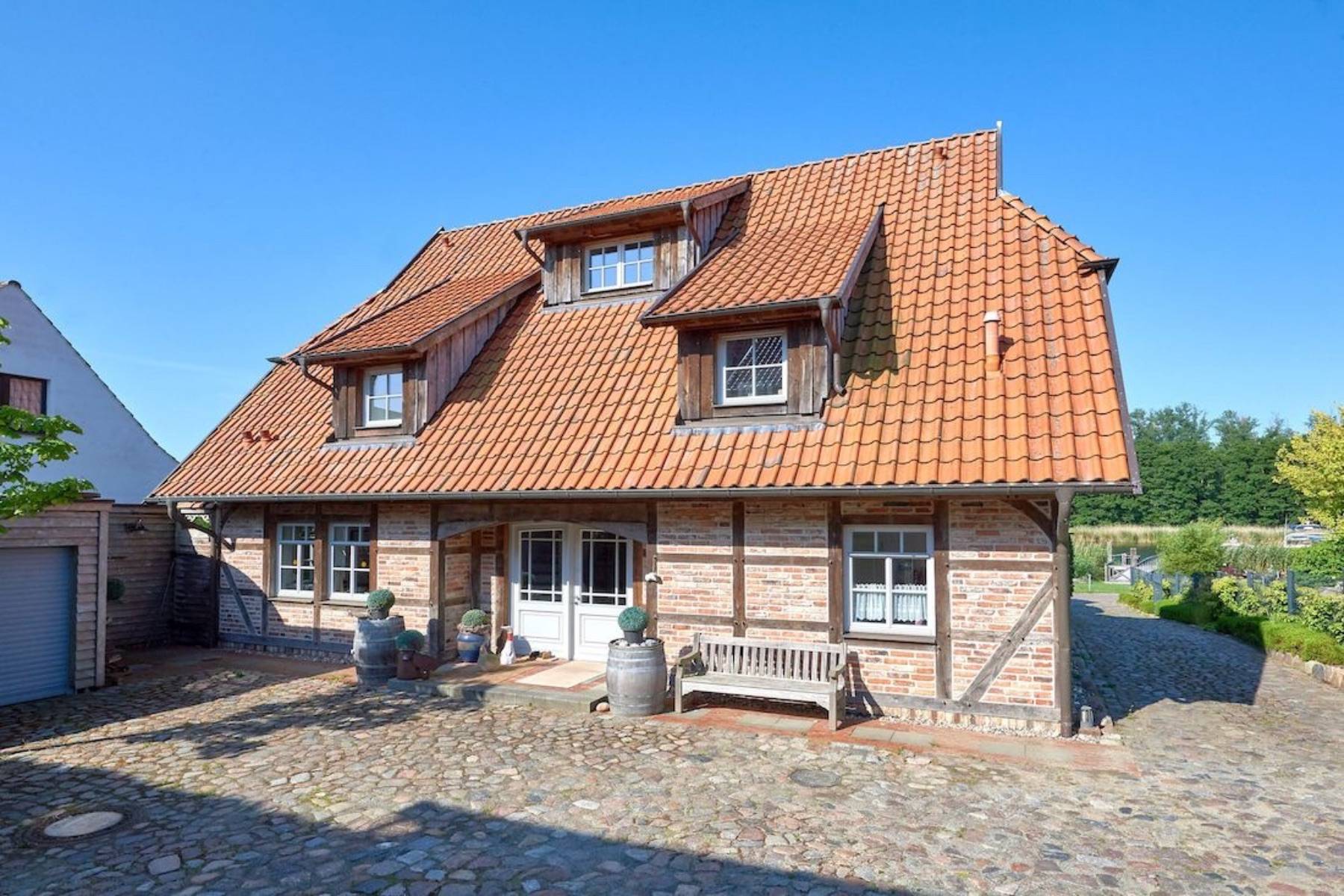 Die ca. 210 m² große Fachwerkvilla verfügt über eine großzügige Terrasse (ca. 35 m²) und einen erhöhten Pavillon zur Südwestseite mit einem wunderschönen Blick über die Lanckener Beek und die in den Greifswalder Bodden sich öffnende Having.