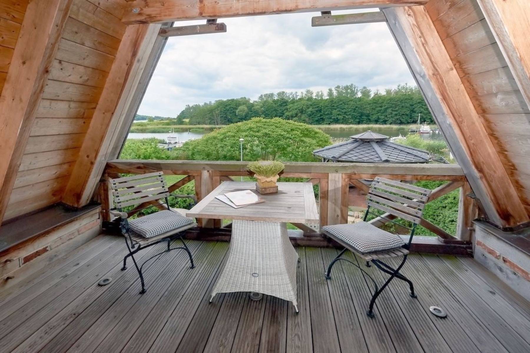 Die sehr großzügig bestuhlte Loggia befindet sich unter einem Spitzgiebel und bietet unter Fachwerkbalken einen traumhaften wind- und wettergeschützten Ausblick über das Wasser.