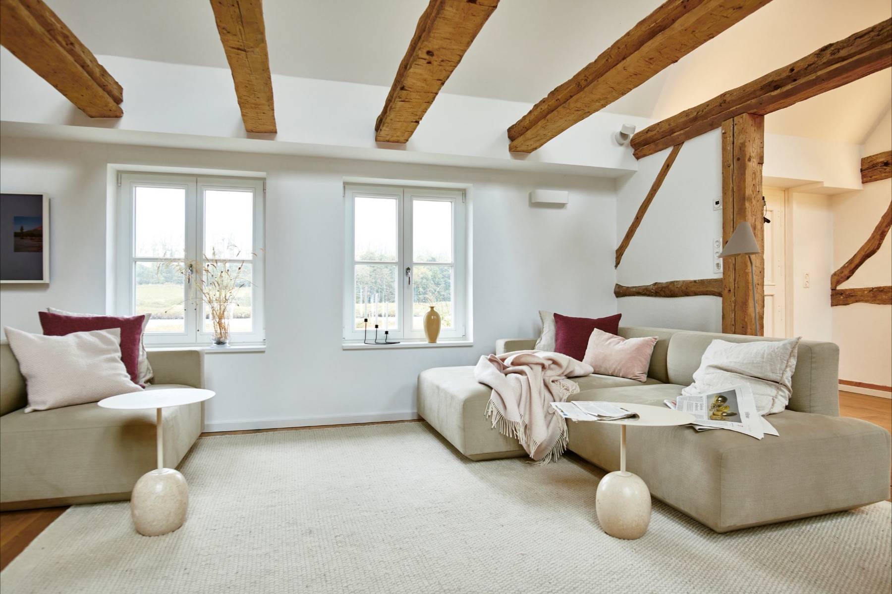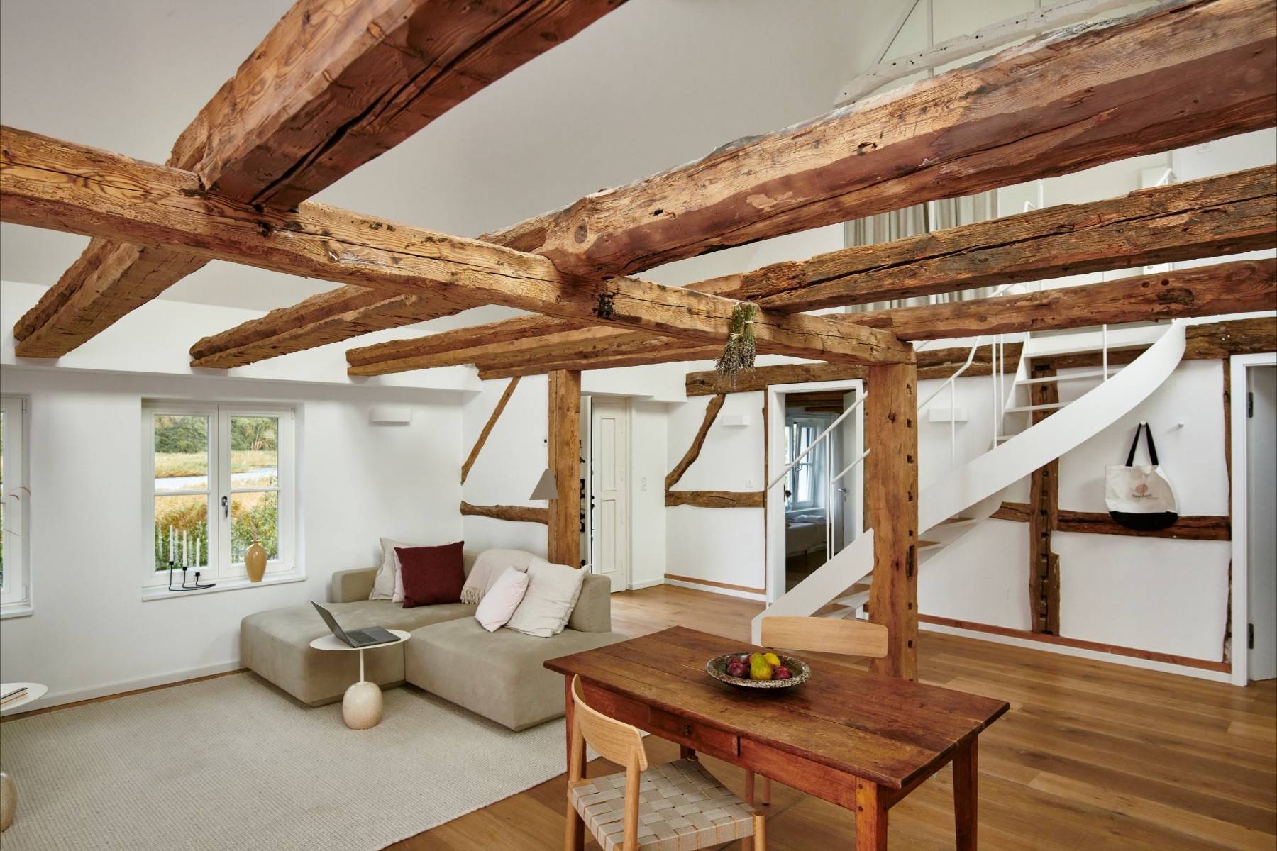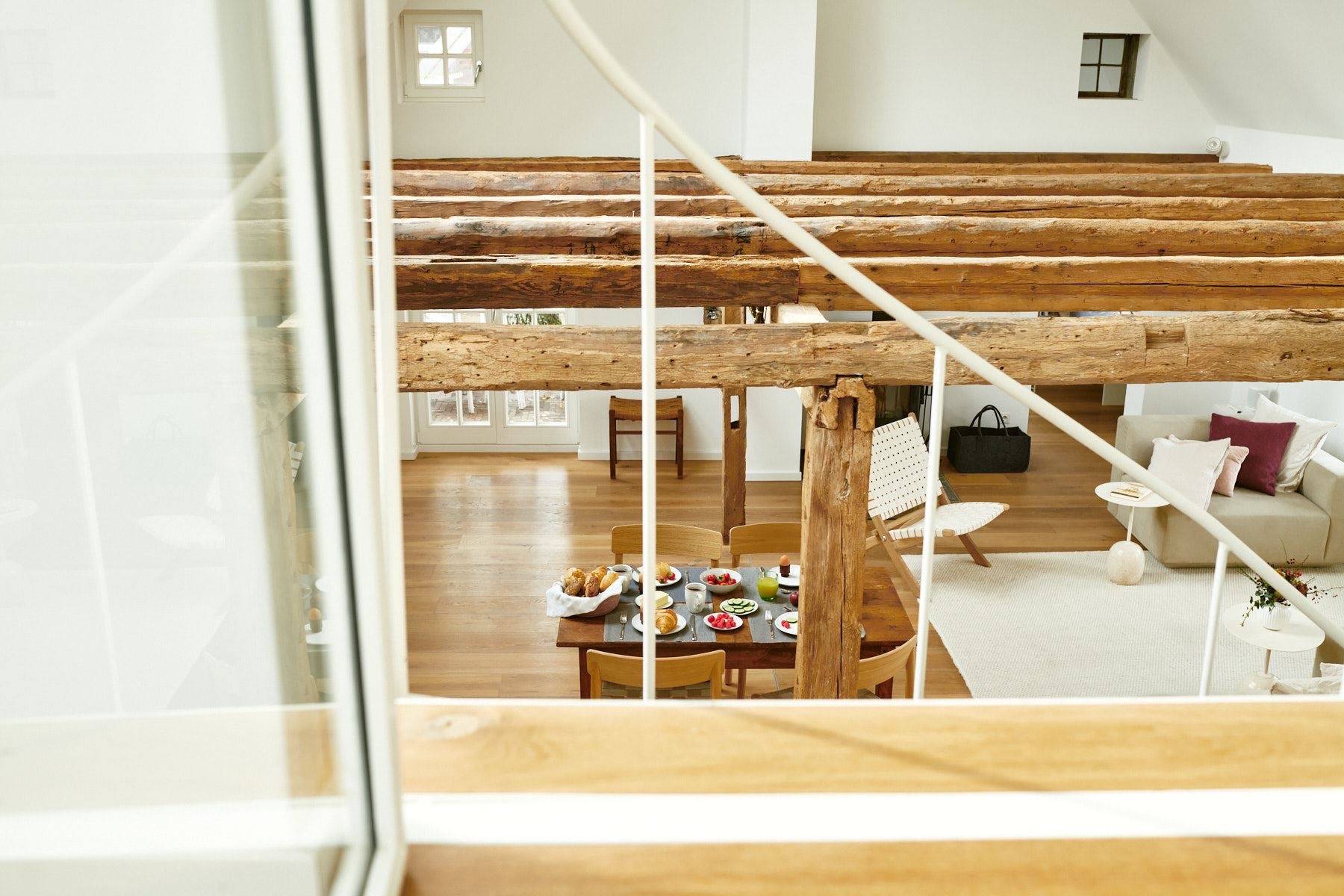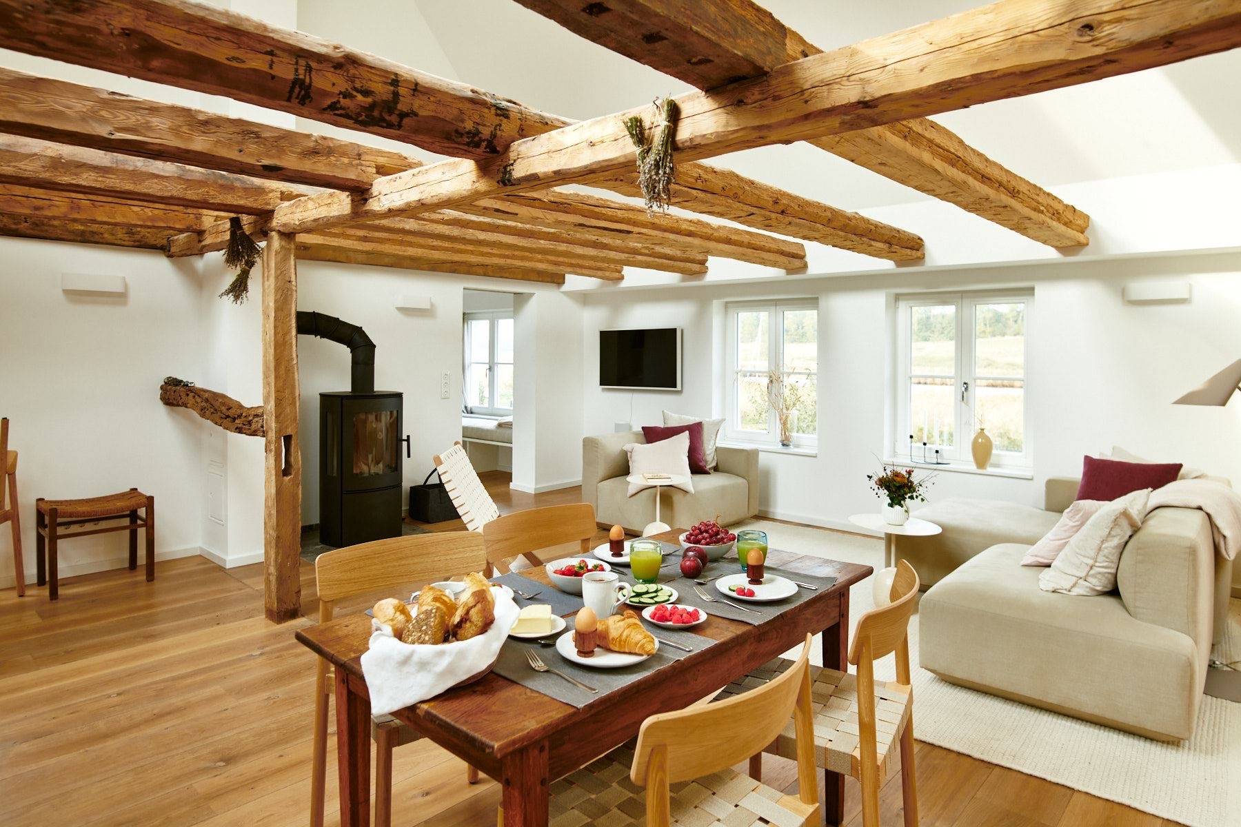 Sobald man durch die Haustür des Ferienhauses gelangt, begeistert der helle und gemütliche Wohnbereich, der mit natürlichen Farben und hochwertigen Materialien zum Entspannen einlädt. Dank der großen Dachfenster strömt viel Tageslicht hinein, in dem die freigelegte Holzkonstruktion zum Vorschein kommt.