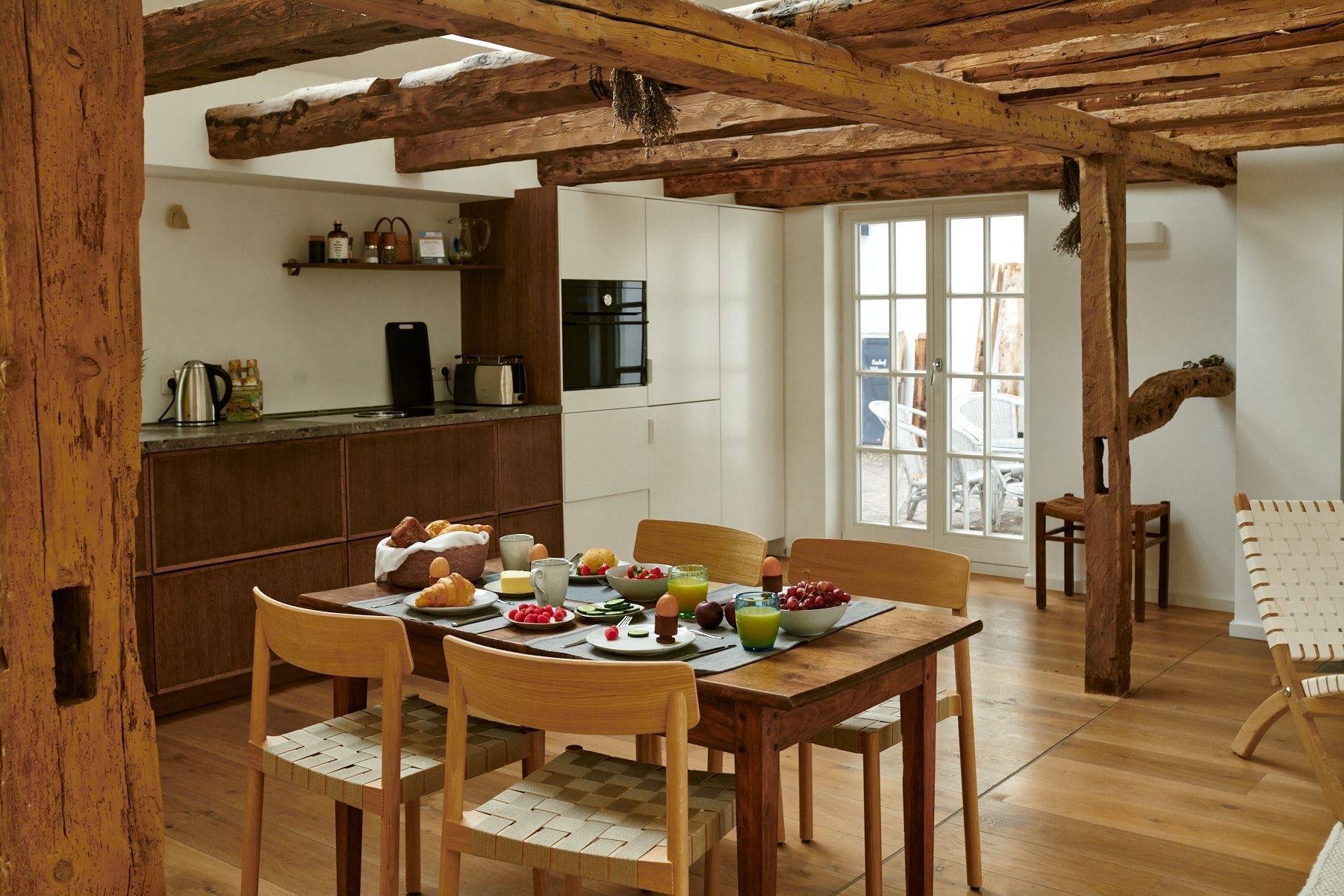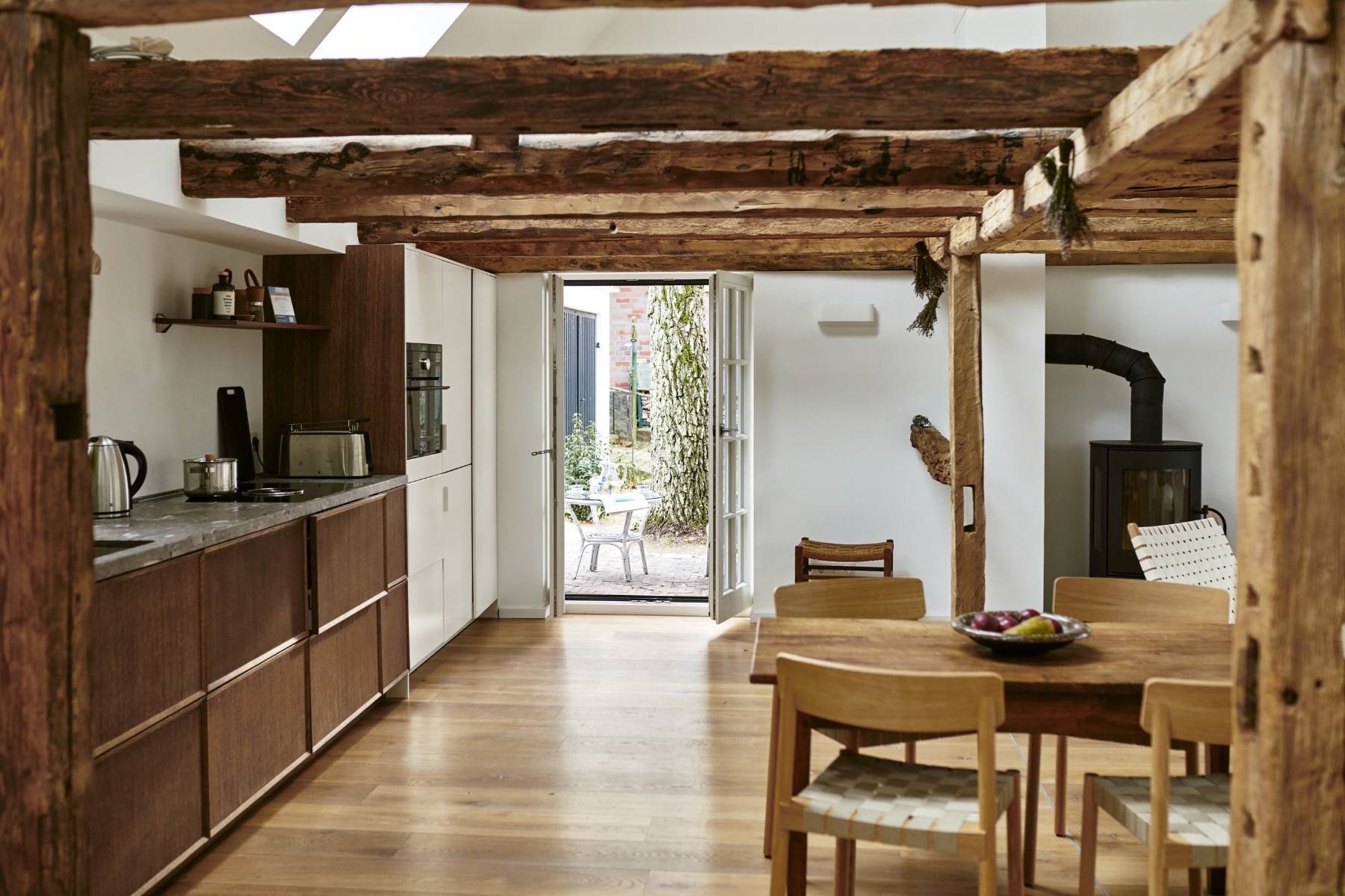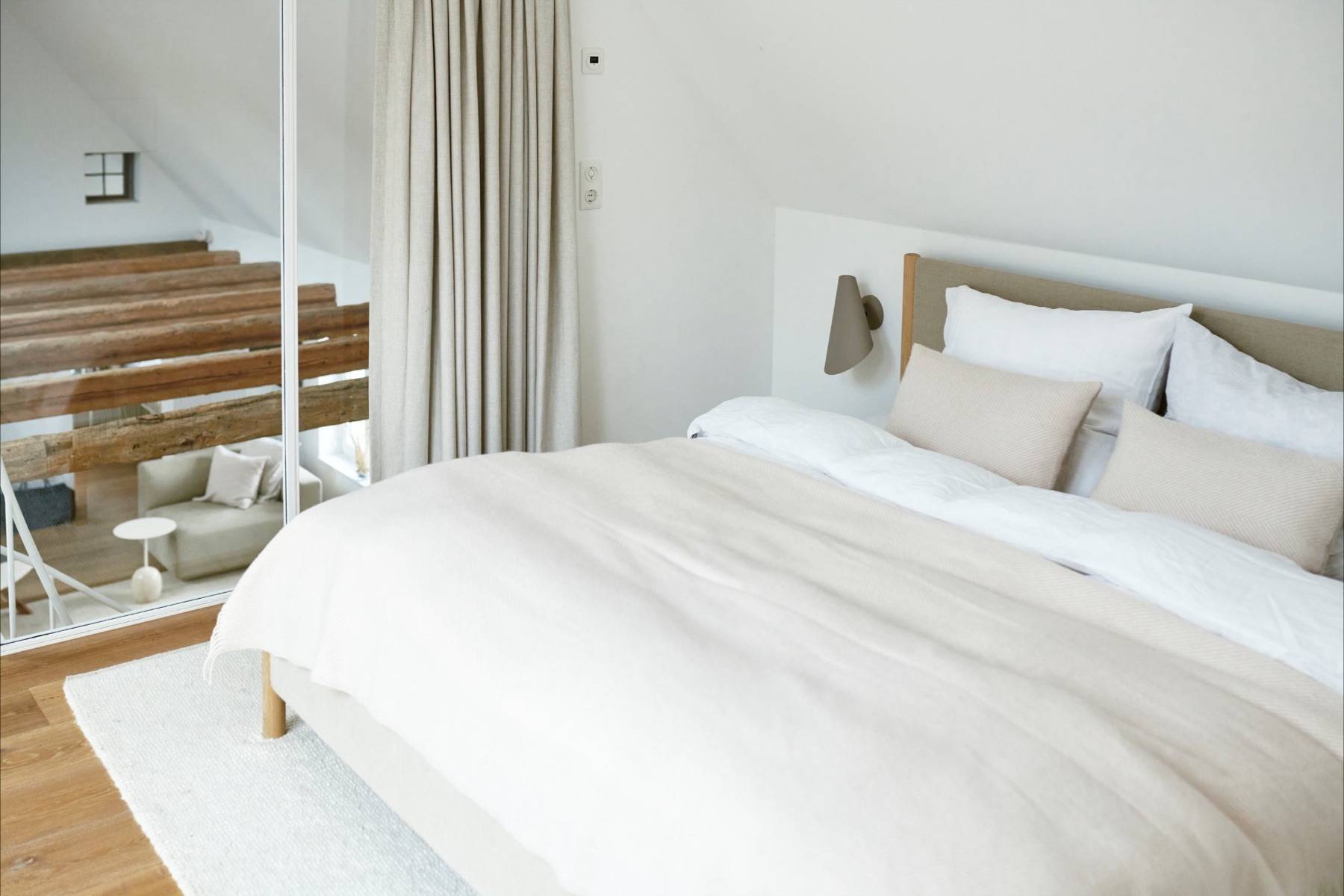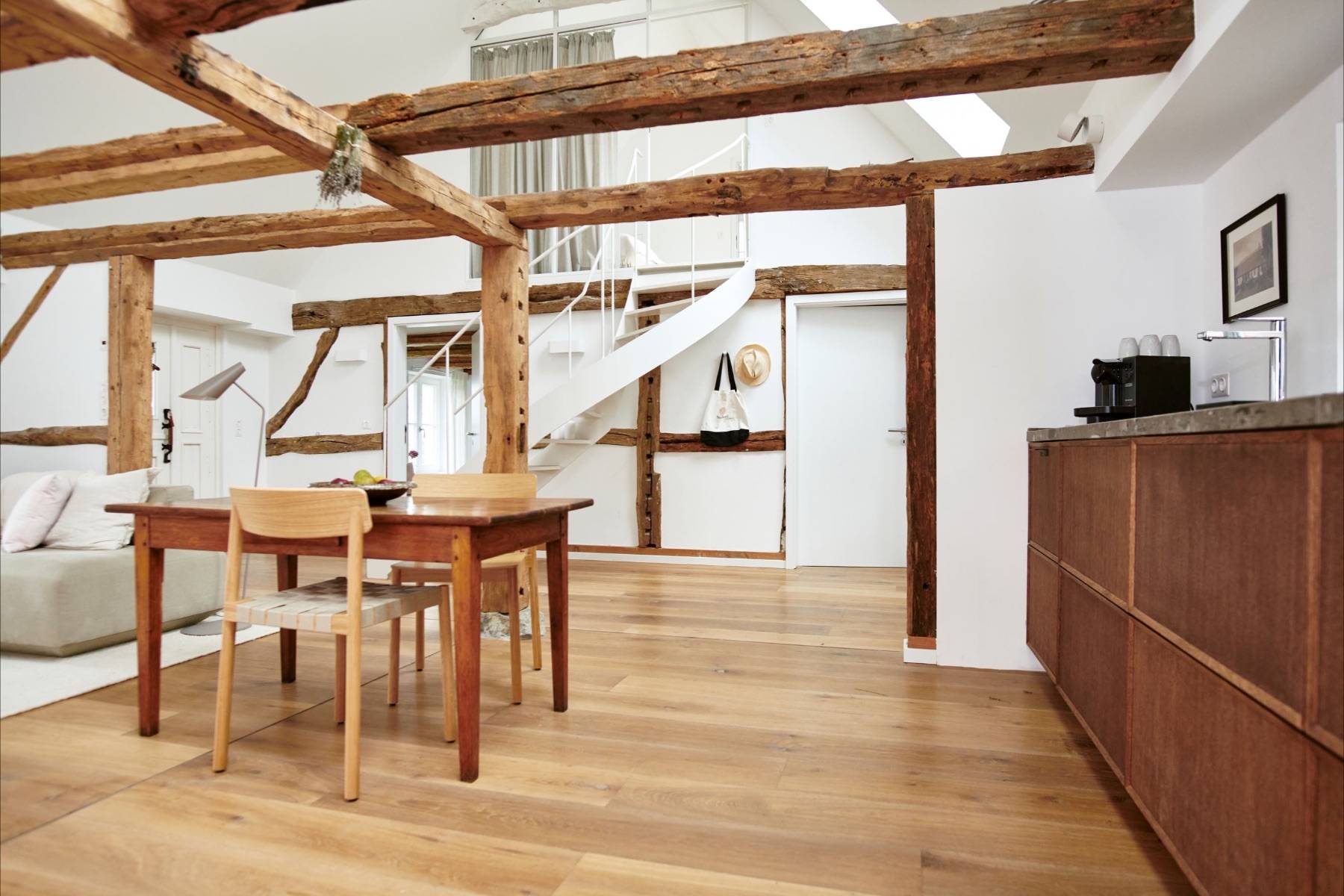 Sobald man durch die Haustür des Ferienhauses gelangt, begeistert der helle und gemütliche Wohnbereich, der mit natürlichen Farben und hochwertigen Materialien zum Entspannen einlädt. Dank der großen Dachfenster strömt viel Tageslicht hinein, in dem die freigelegte Holzkonstruktion zum Vorschein kommt.