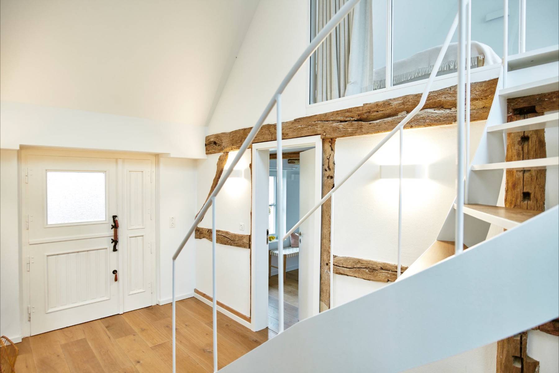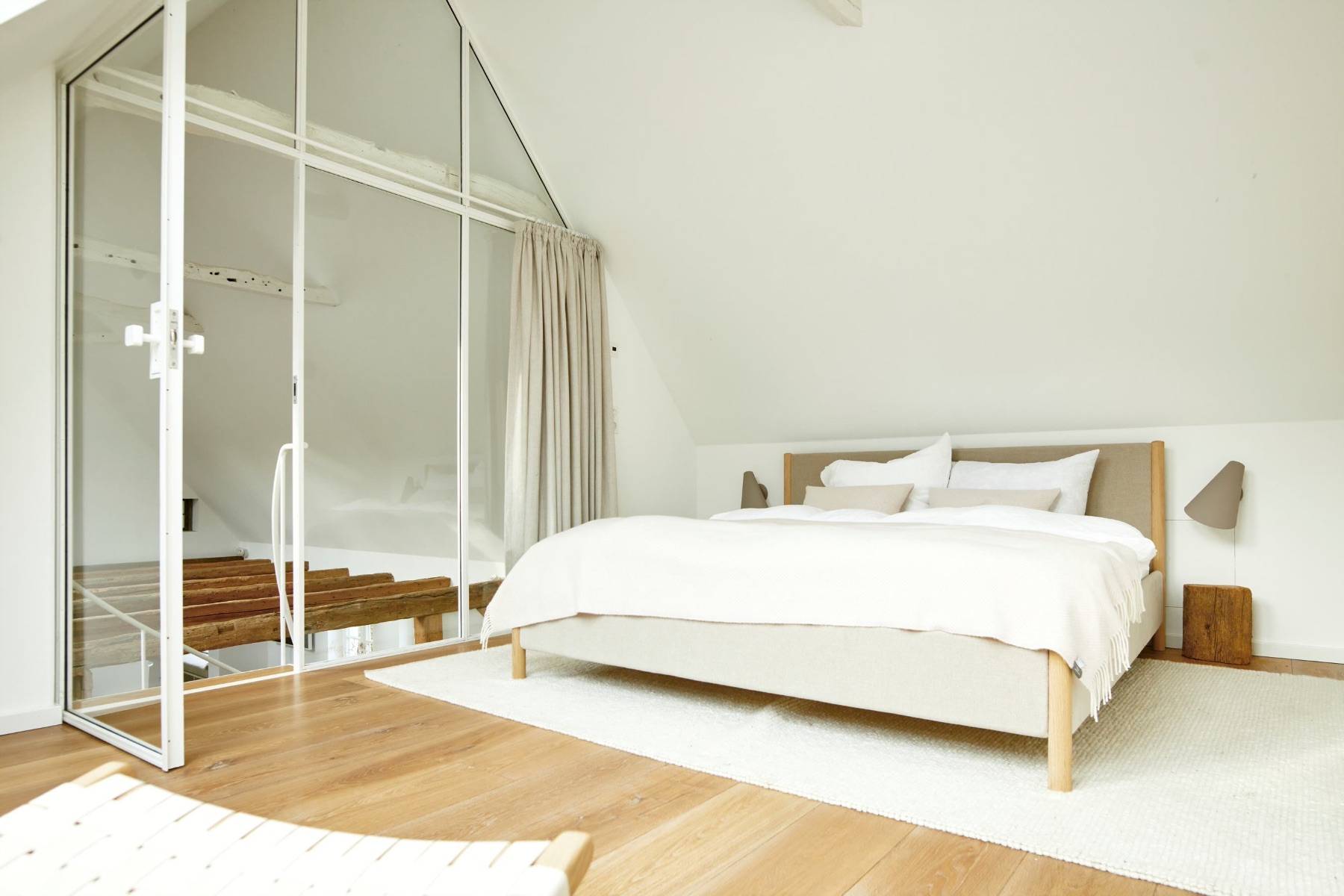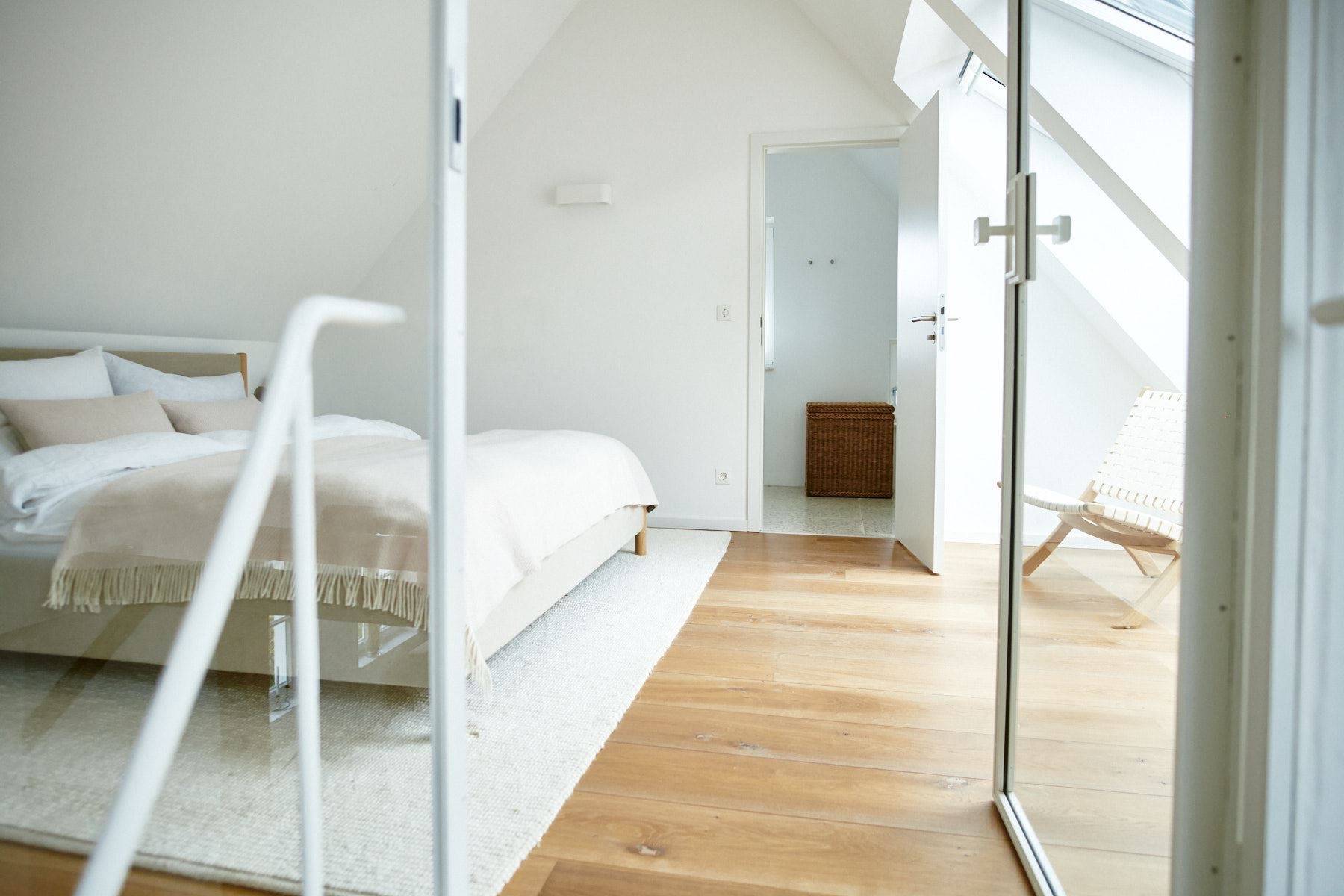Über eine leicht geschwungene Treppe gelangt man in das Obergeschoss, in dem das dritte Schlafzimmer und ein Duschbad auf Sie wartet. Aus diesem Doppelbett wird ein Himmelbett, sofern man durch die hohen Dachfenster in den nächtlichen Sternenhimmel blickt.