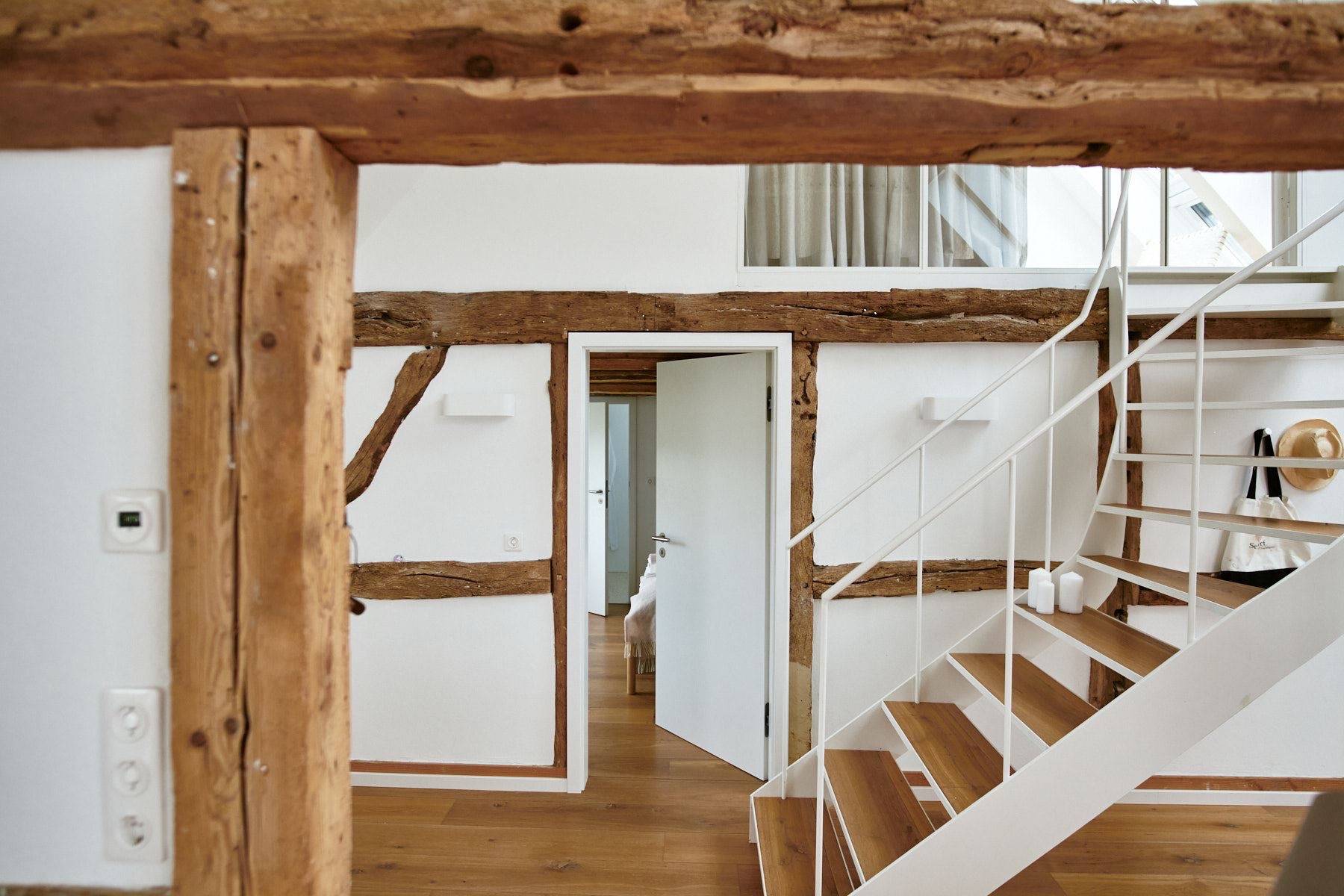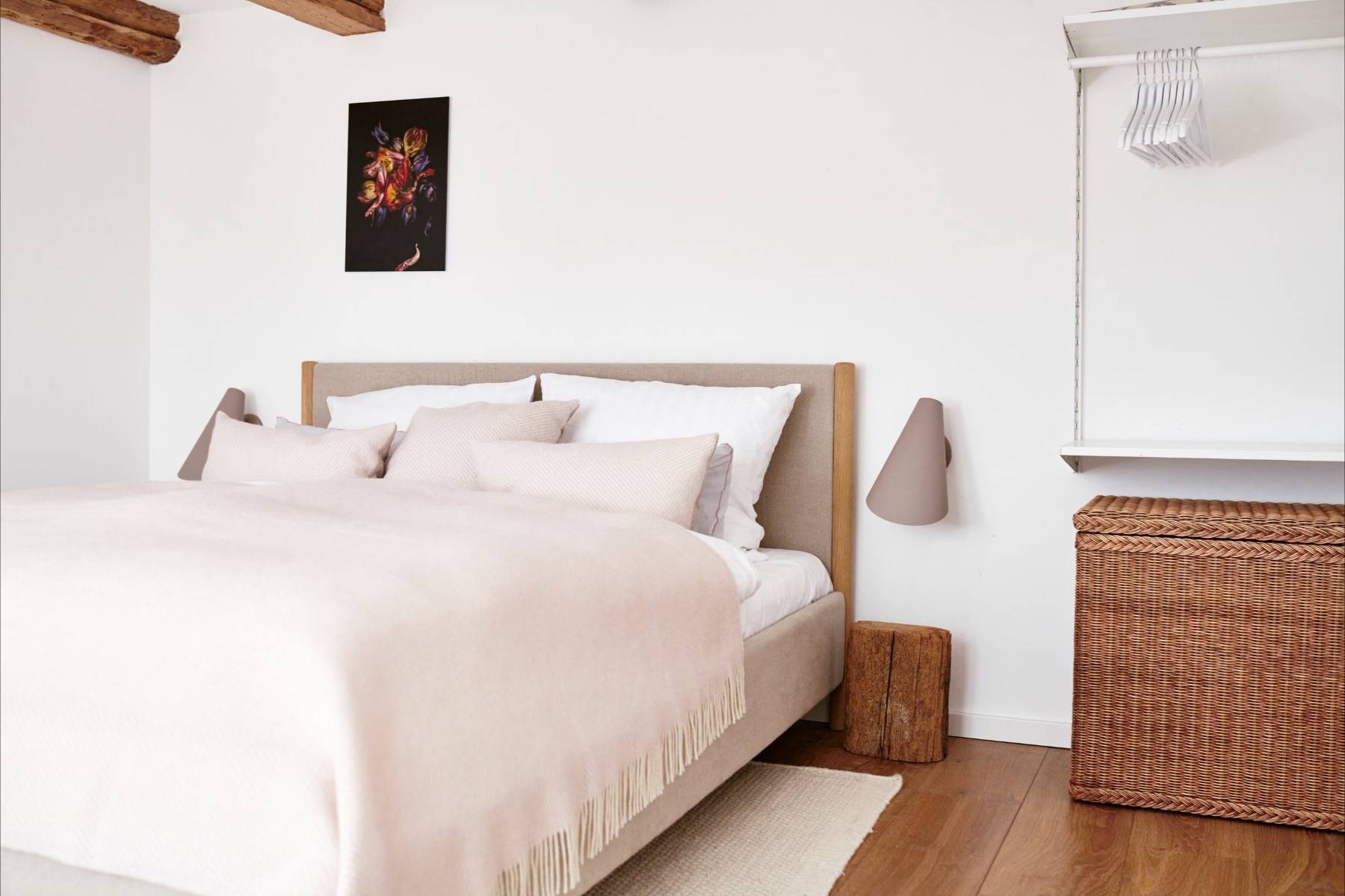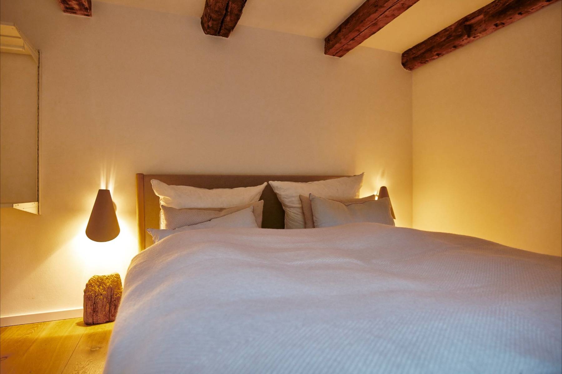Über eine leicht geschwungene Treppe gelangt man in das Obergeschoss, in dem das dritte Schlafzimmer und ein Duschbad auf Sie wartet. Aus diesem Doppelbett wird ein Himmelbett, sofern man durch die hohen Dachfenster in den nächtlichen Sternenhimmel blickt.