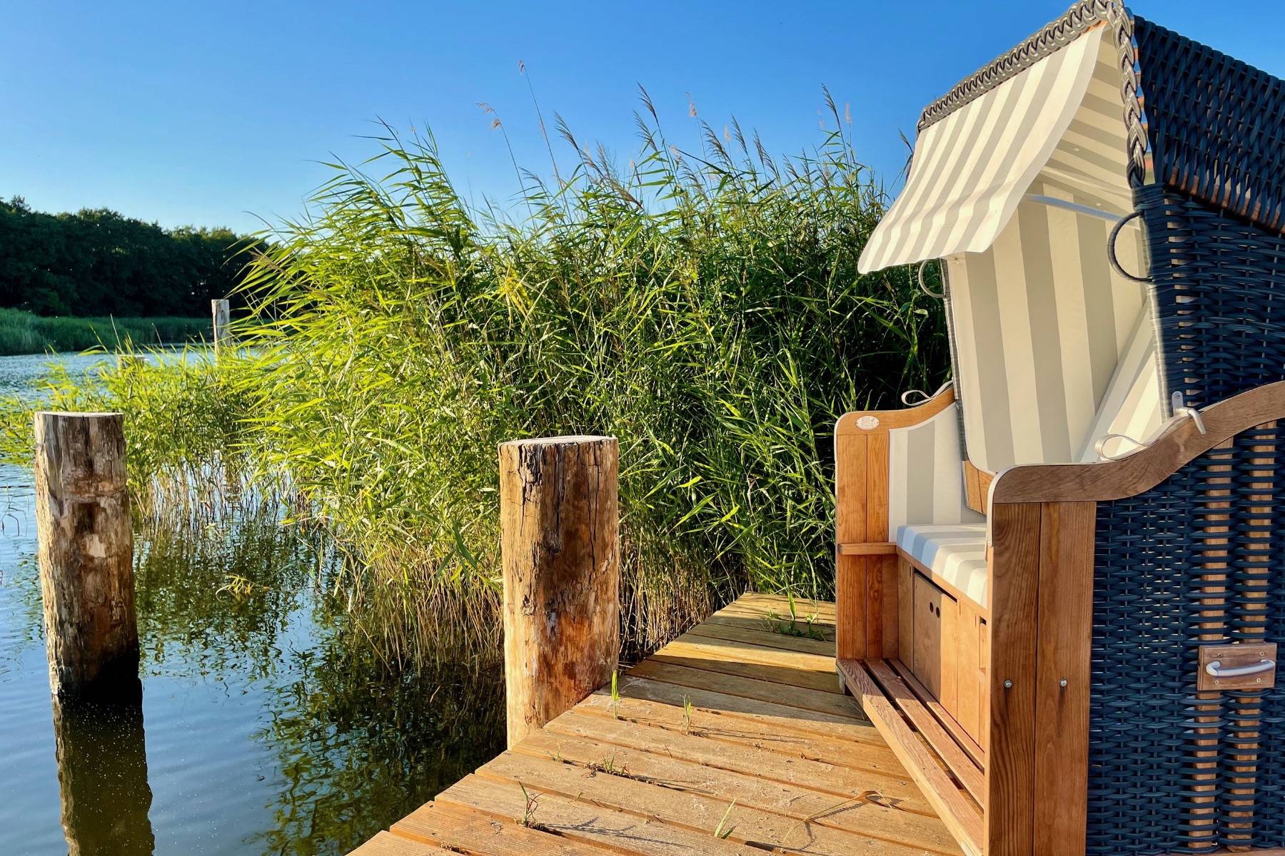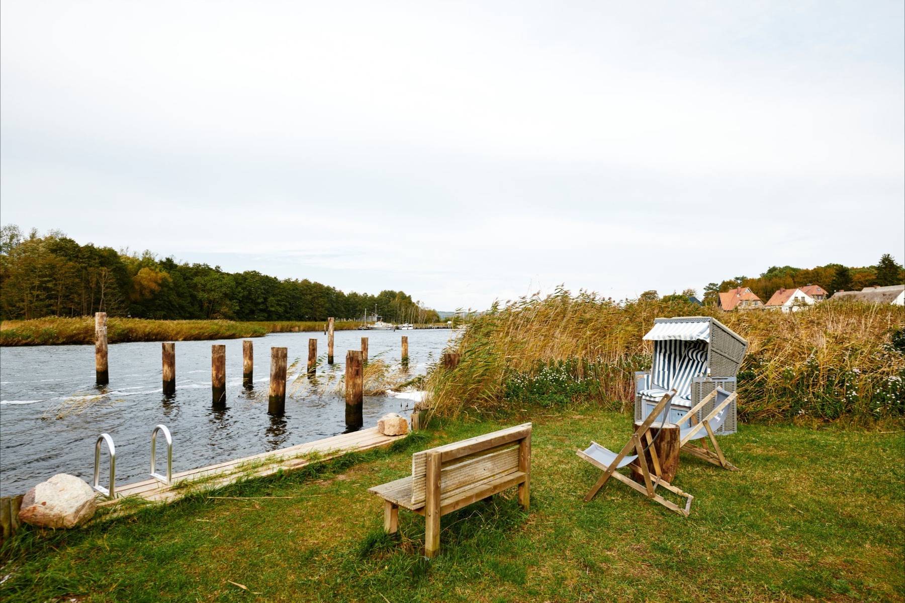 Ganz vorne, wo die Having sich öffnet und offen in die Ostsee übergeht, befindet sich das Ferienhaus Hideaway, umgeben von grüner Landschaft, himmlischer Ruhe und einem verträumten Blick auf das Wasser und das Jagdschloss Granitz. Hier hört man allenfalls die Vögel zwitschern und den Wind über die Lanckener Bek rauschen. Ein idealer Ort für Ruhe und Erholung.