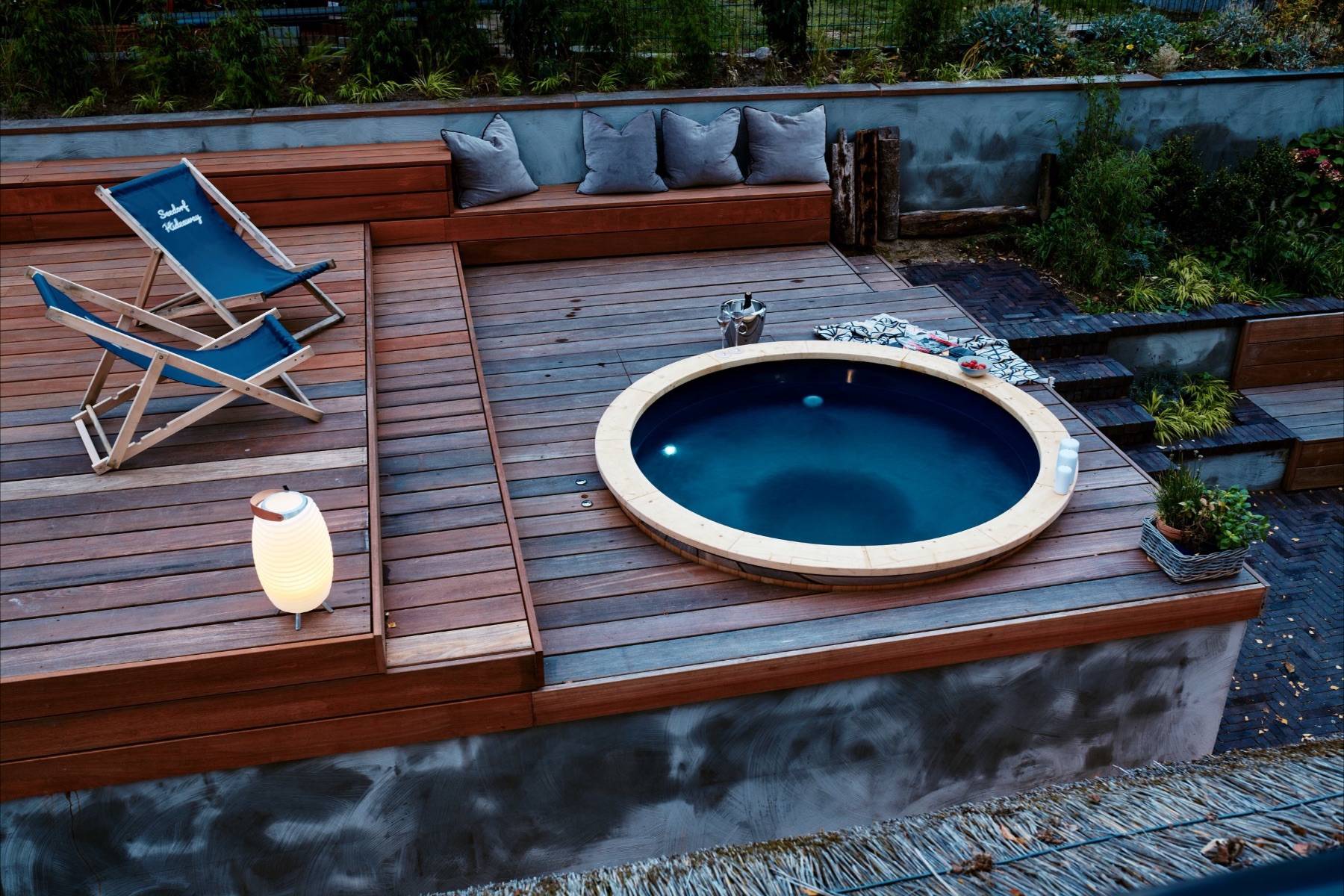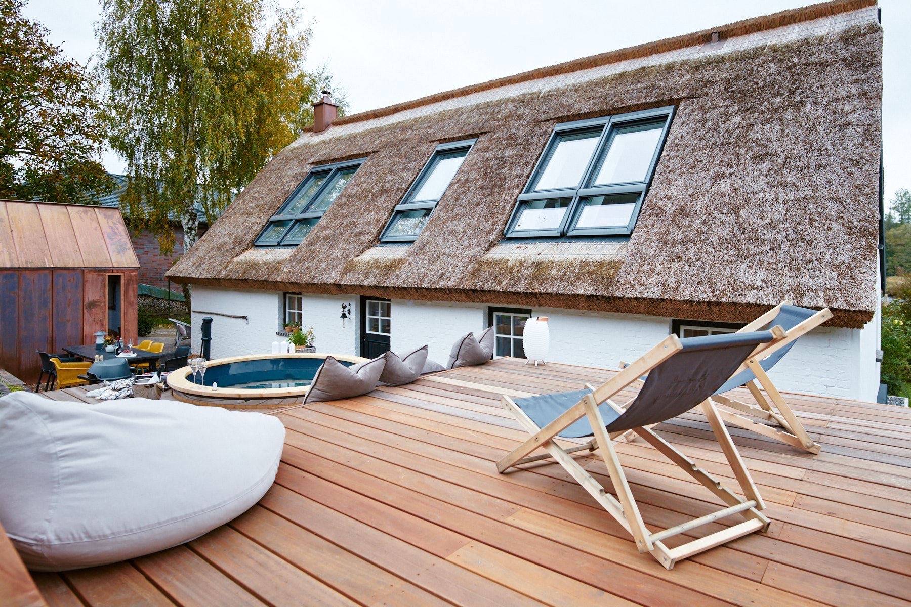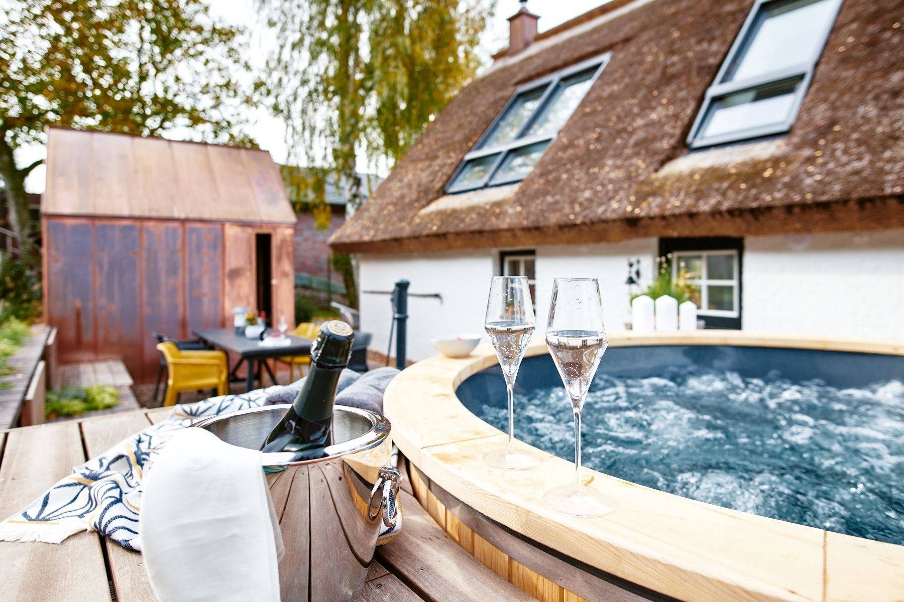Für Wellness- Liebhaber eröffnet sich hinter dem Haus eine kleine Wellnessoase. Über wenige Stufen gelangt man auf ein erhöhtes Plateau, auf dem man in Ruhe ein Buch lesen kann, oder nach dem Saunagang im sprudelnden Hot Tub entspannt.