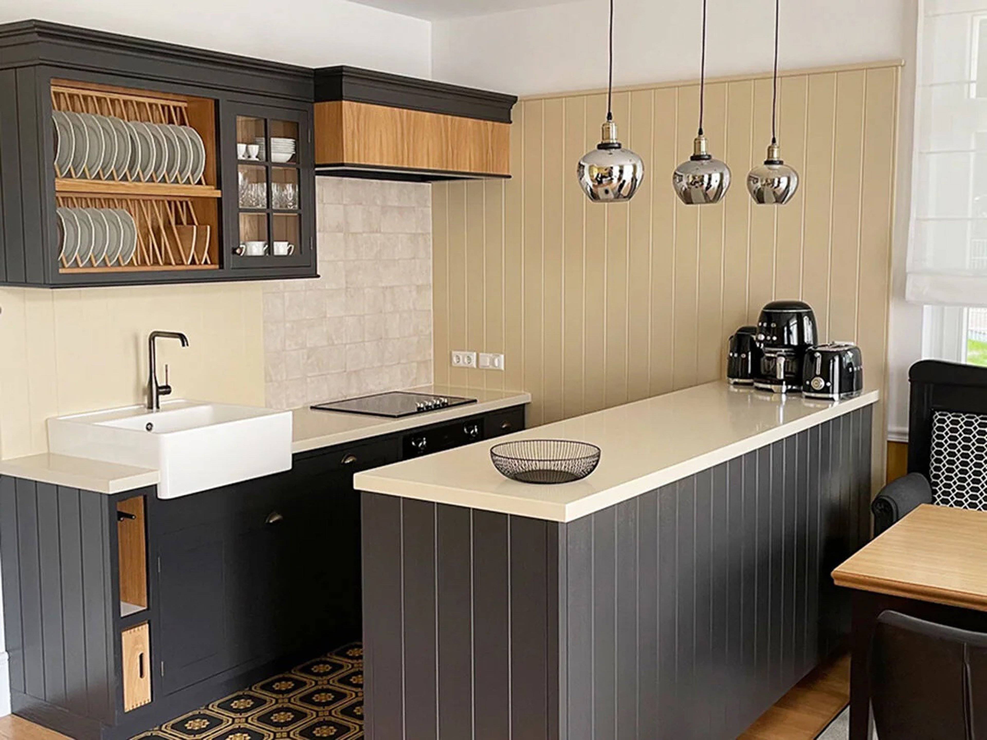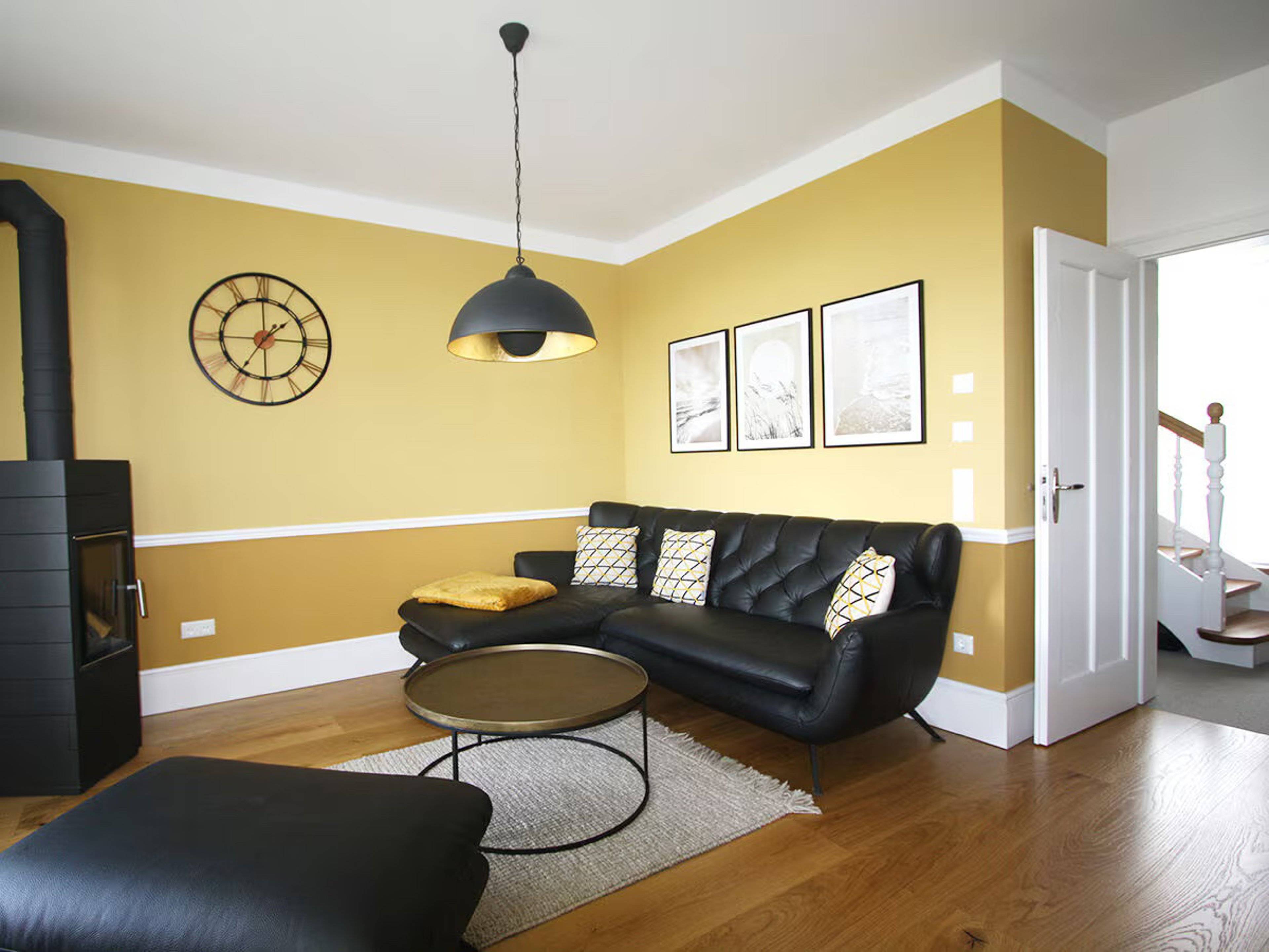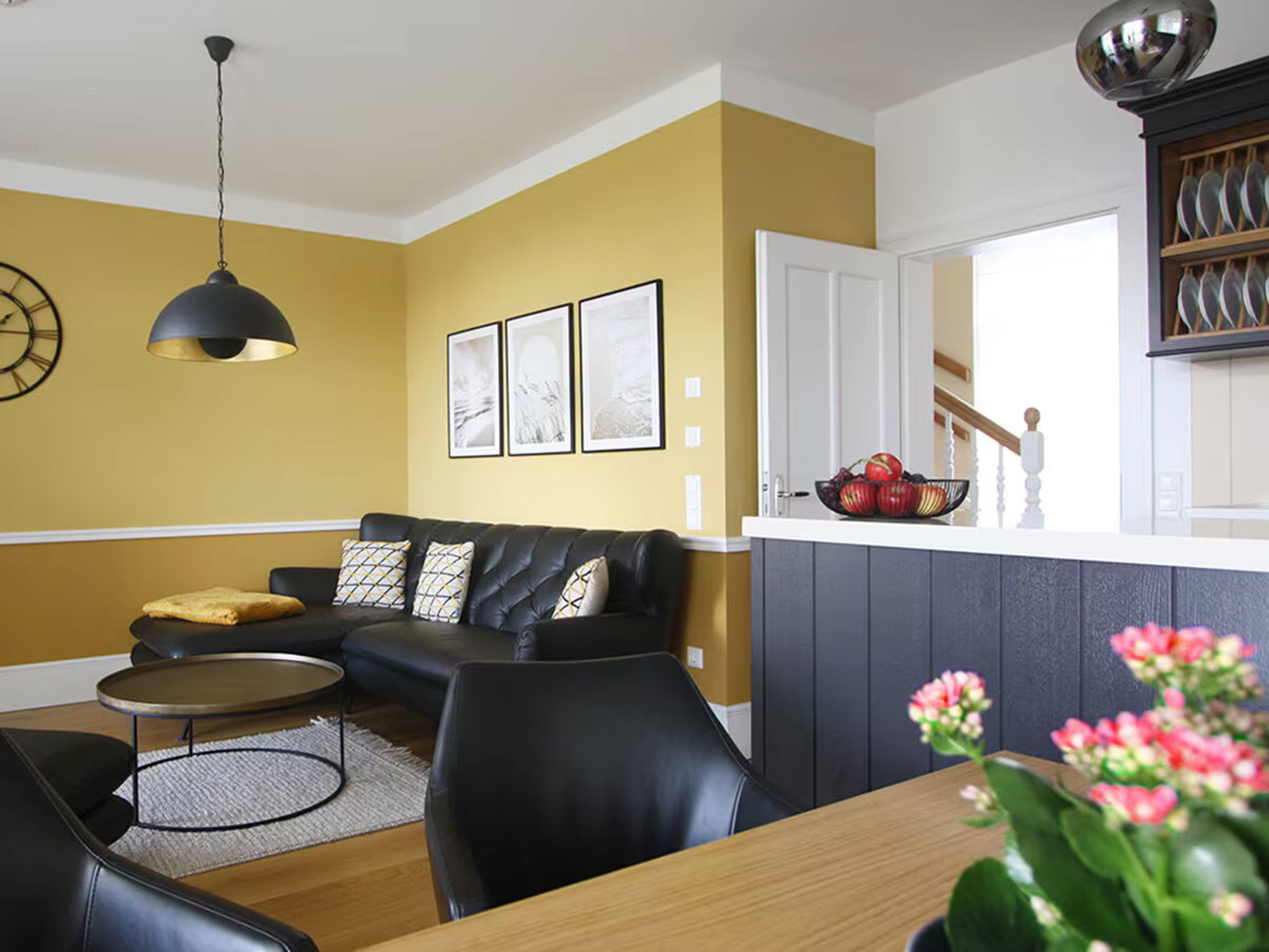 Die gemütliche Wohnküche im englischen Landhausstil ist voll ausgestattet, der Essbereich bietet als Besonderheit ein schwedischen Küchensofa. Zum dem lichtdurchfluteten Wohnbereich gehören eine gemütliche Eck-Couch und ein Gas-Kamin.
