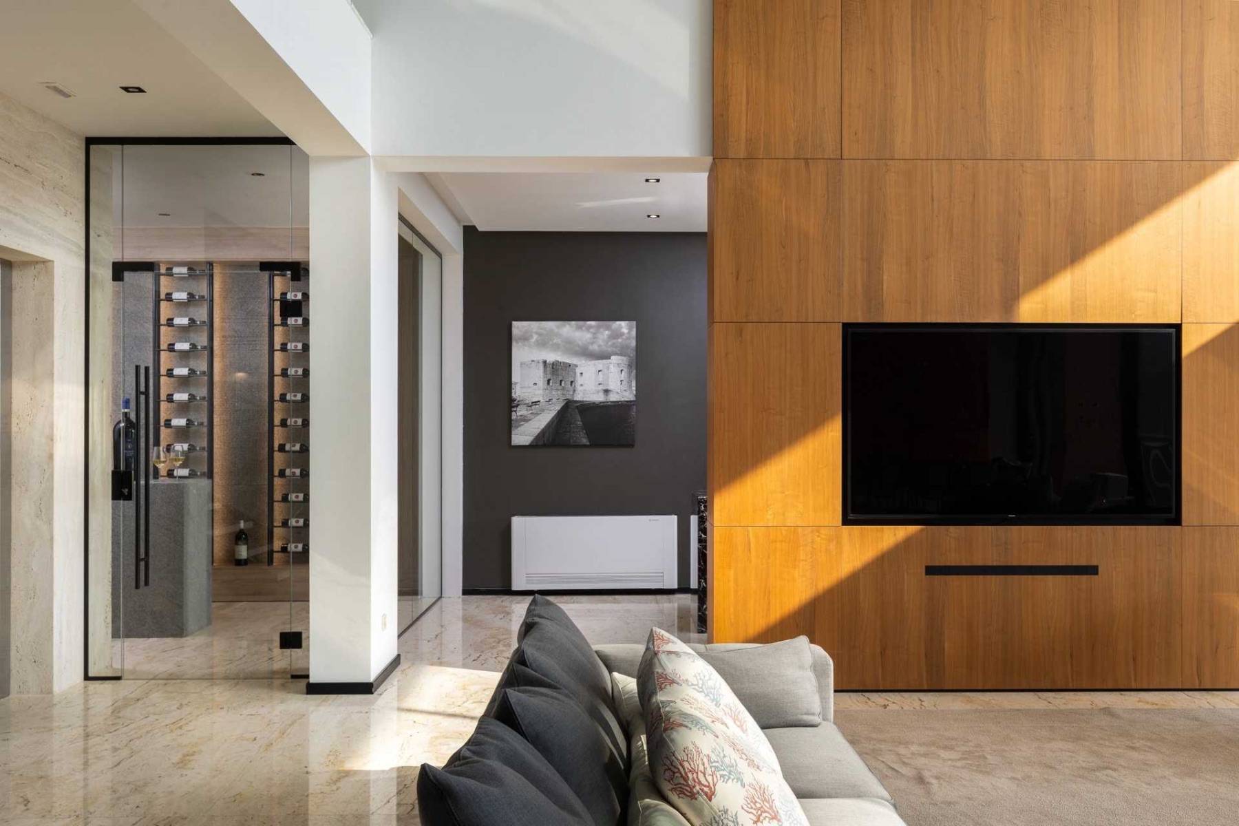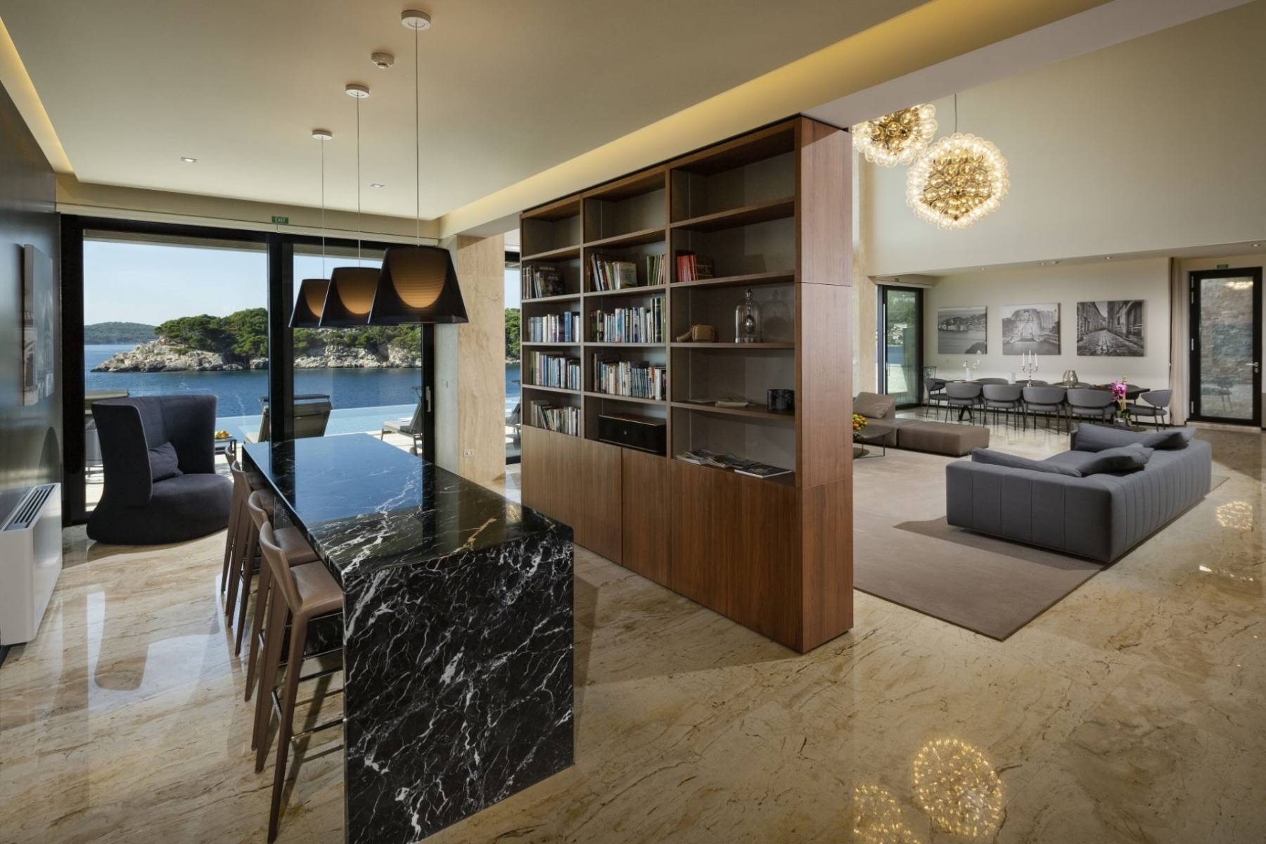 Bis zu 14 Personen kann dieses Ferienhaus beherbergen, die sich in sechs moderne Schlafzimmer mit Meerblick und sechs ebenso moderne Badezimmer verteilen. Insgesamt erstreckt sich das Anwesen auf 700 qm feinster Wohnfläche, die von Sonnenlicht durchflutet wird. Dies wird insbesondere im Wohnbereich deutlich, da durch die fünf Meter hohe Fensterfront viel Tageslicht eindringt und dem Raum eine behagliche Wärme verleiht. Vor dem großen Flatscreen lädt eine gemütliche Sofalandschaft von Minotti zum verweilen ein. Die mit Holz verkleidete Wand dient als Raumteiler, hinter dem sich eine. Bibliothek verbirgt. Auf der gegenüberliegenden Seite ist ein Esstisch für 10 Personen vorhanden, der an die offene Luxusküche grenzt.