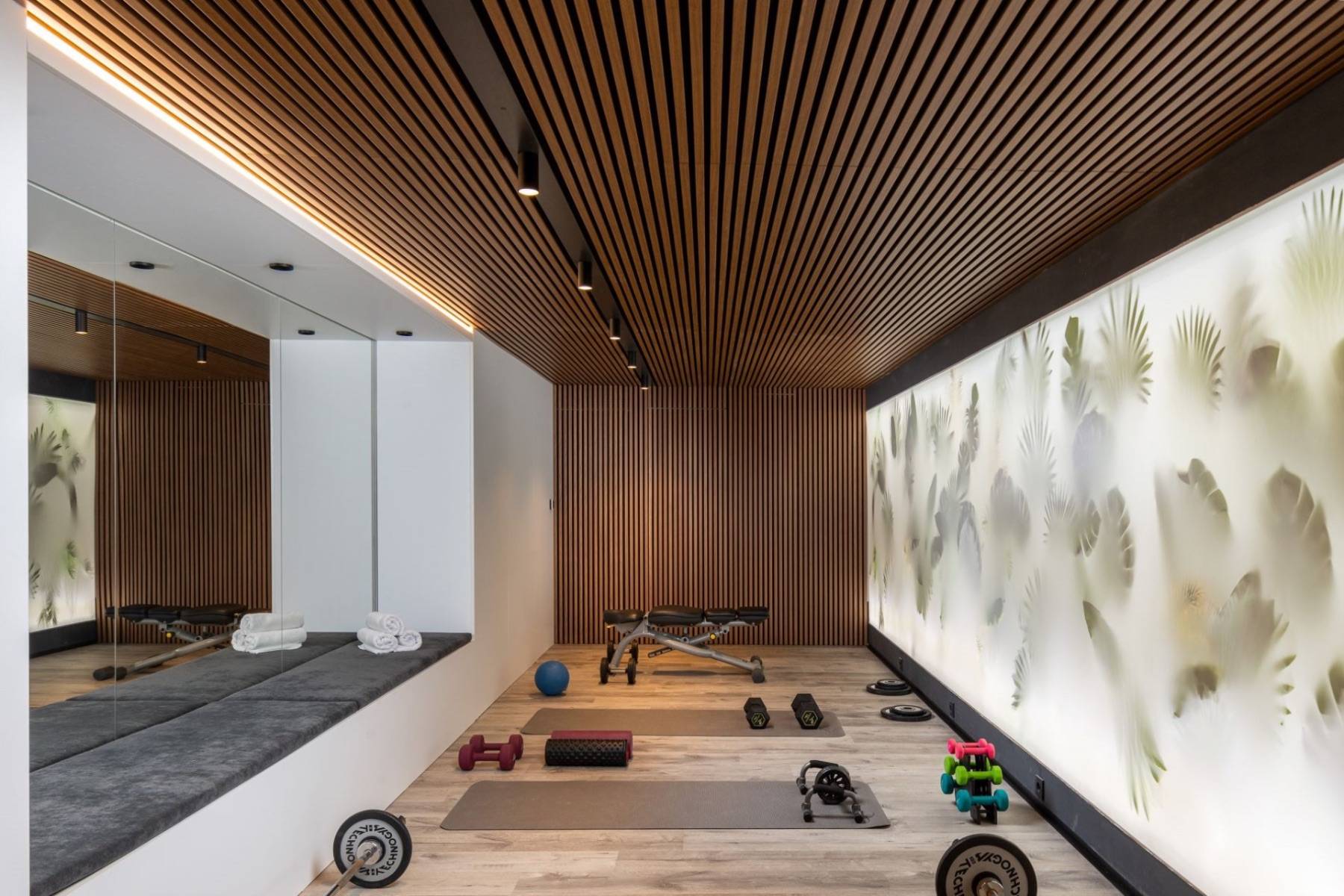 Die Villa Amelie verfügt über einen eigenen Fitnessraum mit zahlreichen Hanteln, Yogamatten und anderen Geräten. Wer sich für Sport nicht begeistern kann, findet im gegenüberliegenden Raum vielleicht sein Glück: ein klimatisierter Raum samt zahlreichen Weinen lagert hier, der auf eine Verkostung wartet.