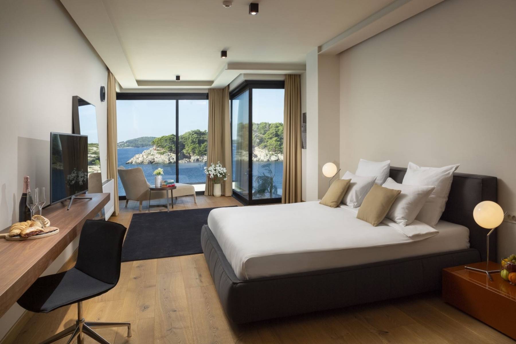 Alle Schlafzimmer sind großzügig geschnitten, mit einem Doppelbett und einem Flatscreen versehen und haben teils einen direkten Blick auf das Meer. Jedes Schlafzimmer hat sein eigenes Badezimmer en suite, die unterschiedlich gestaltet sind.