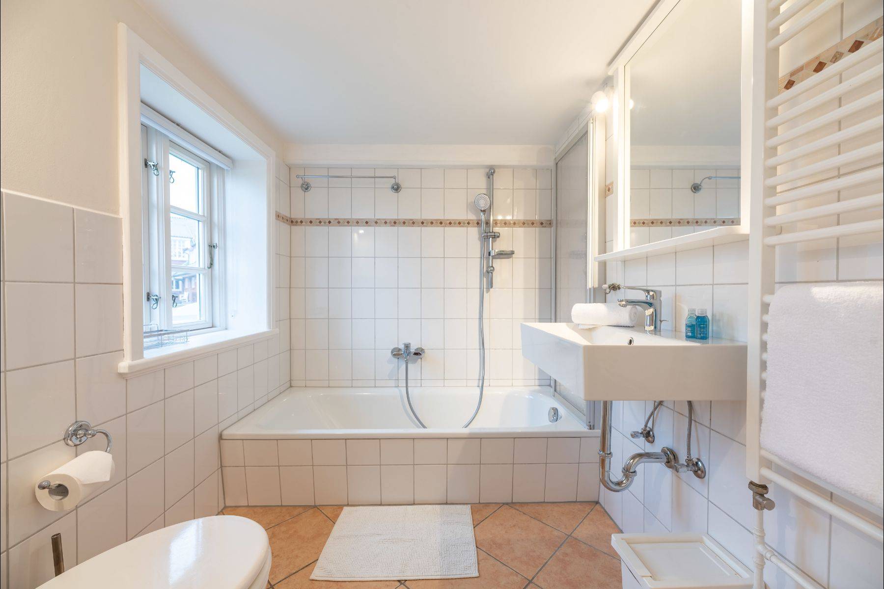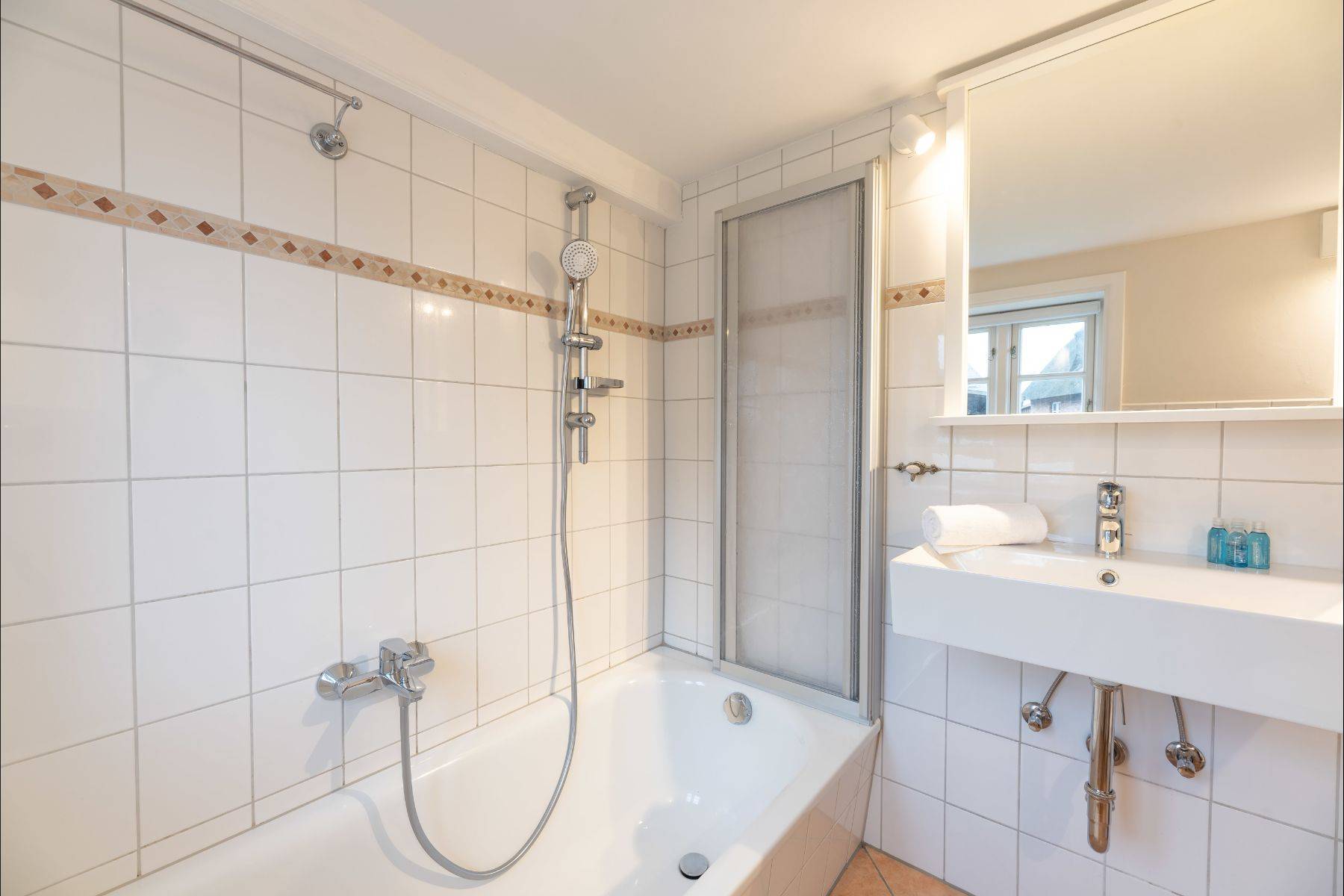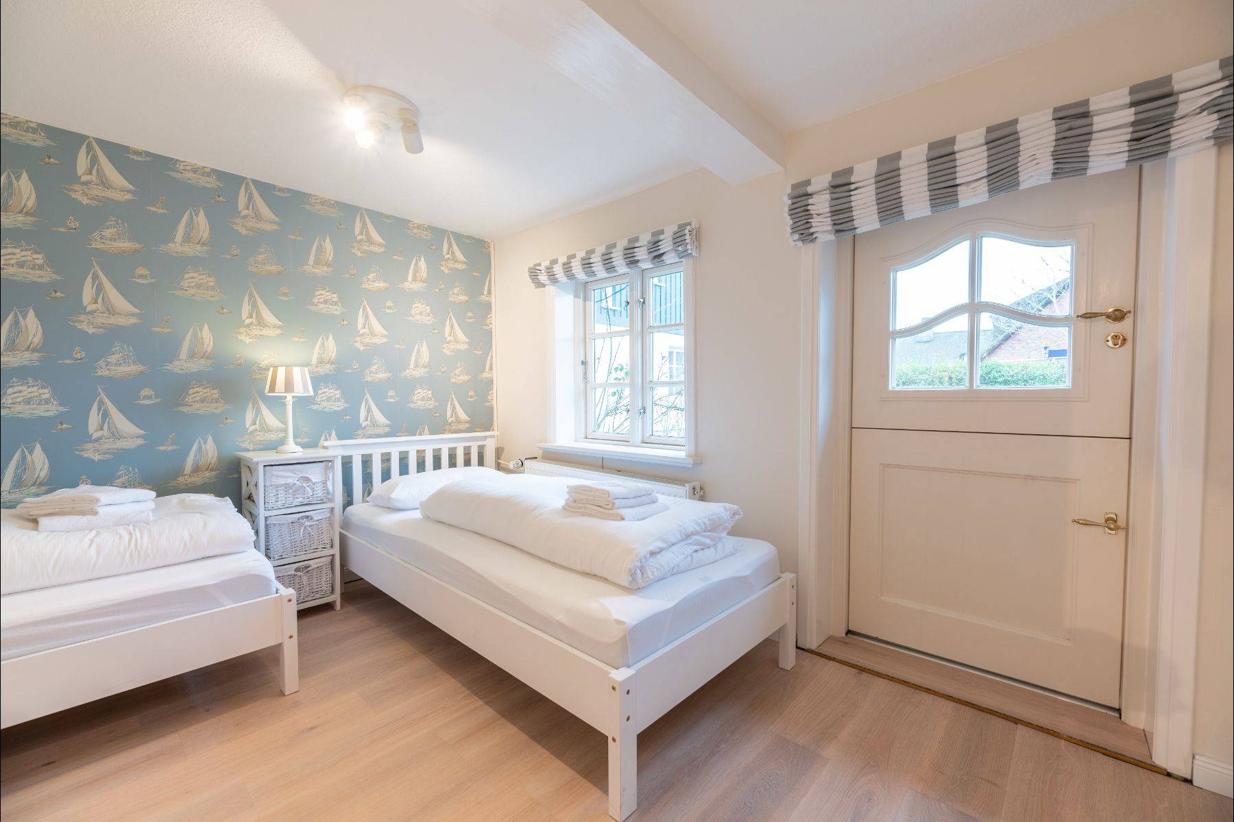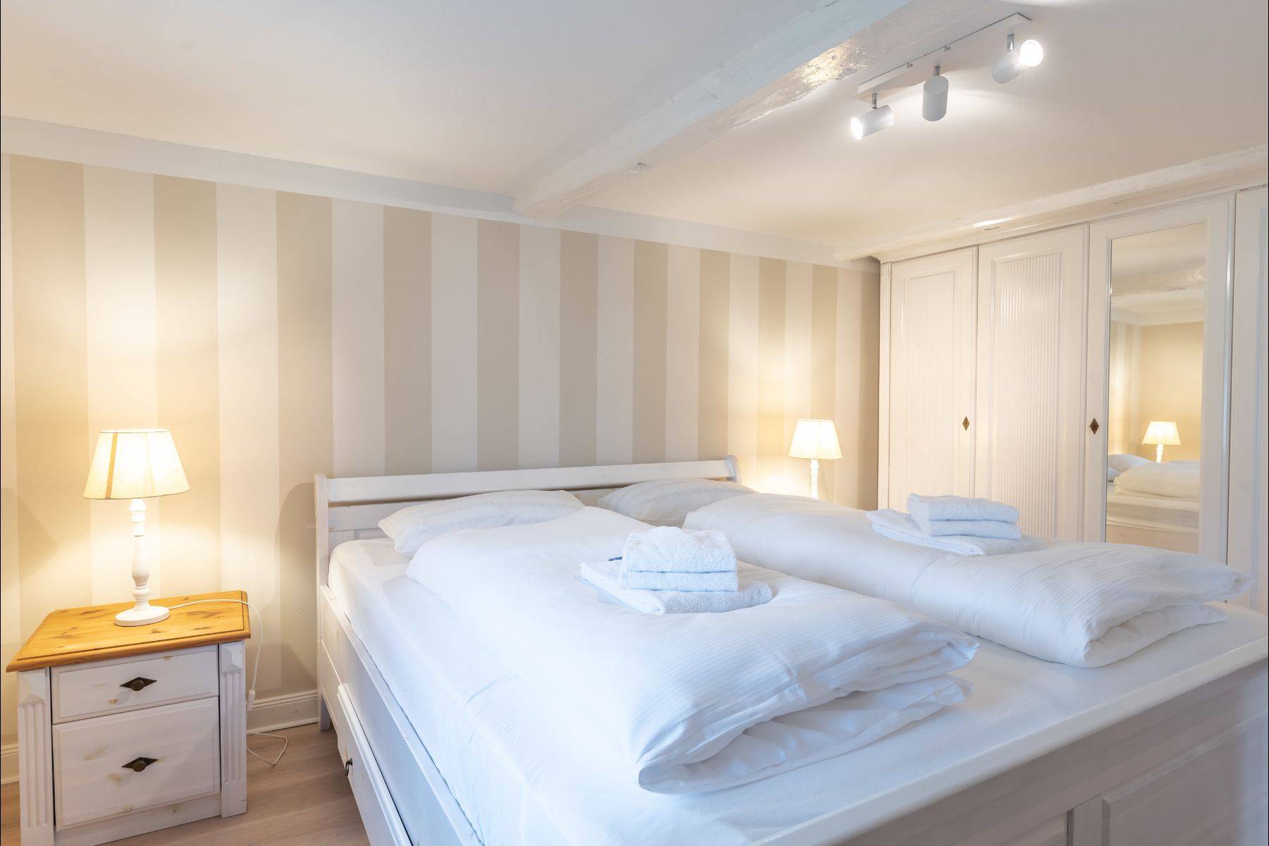 Das Haus verfügt über zwei Schlafzimmer. Ein Schlafzimmer mit Doppelbett (180×200) sowie ein weiteres Schlafzimmer mit zwei Einzelbetten (jeweils 90×200). Das Bad mit Badewanne/Dusche und WC ist hell und lichtdurchflutet und zusätzlich mit einer Fußbodenheizung ausgestattet.