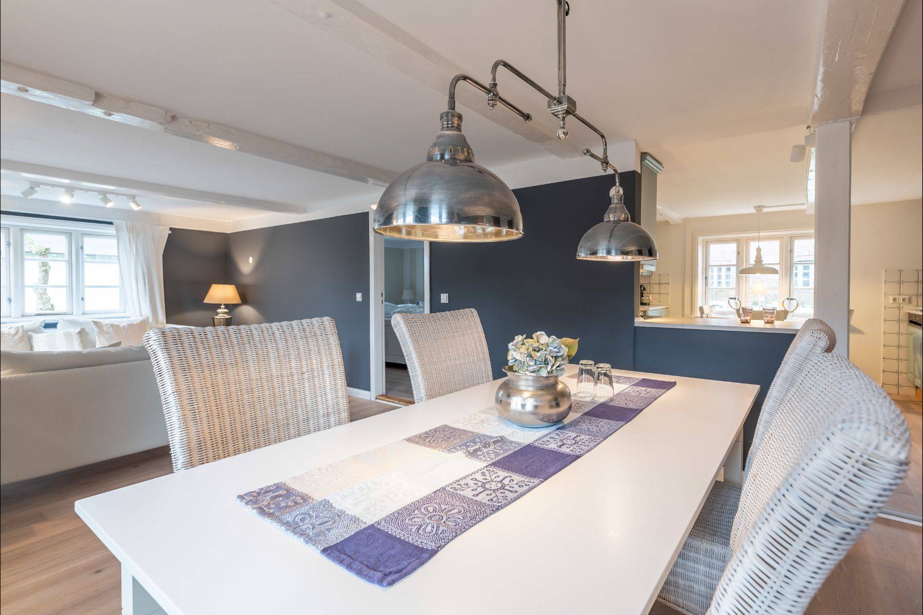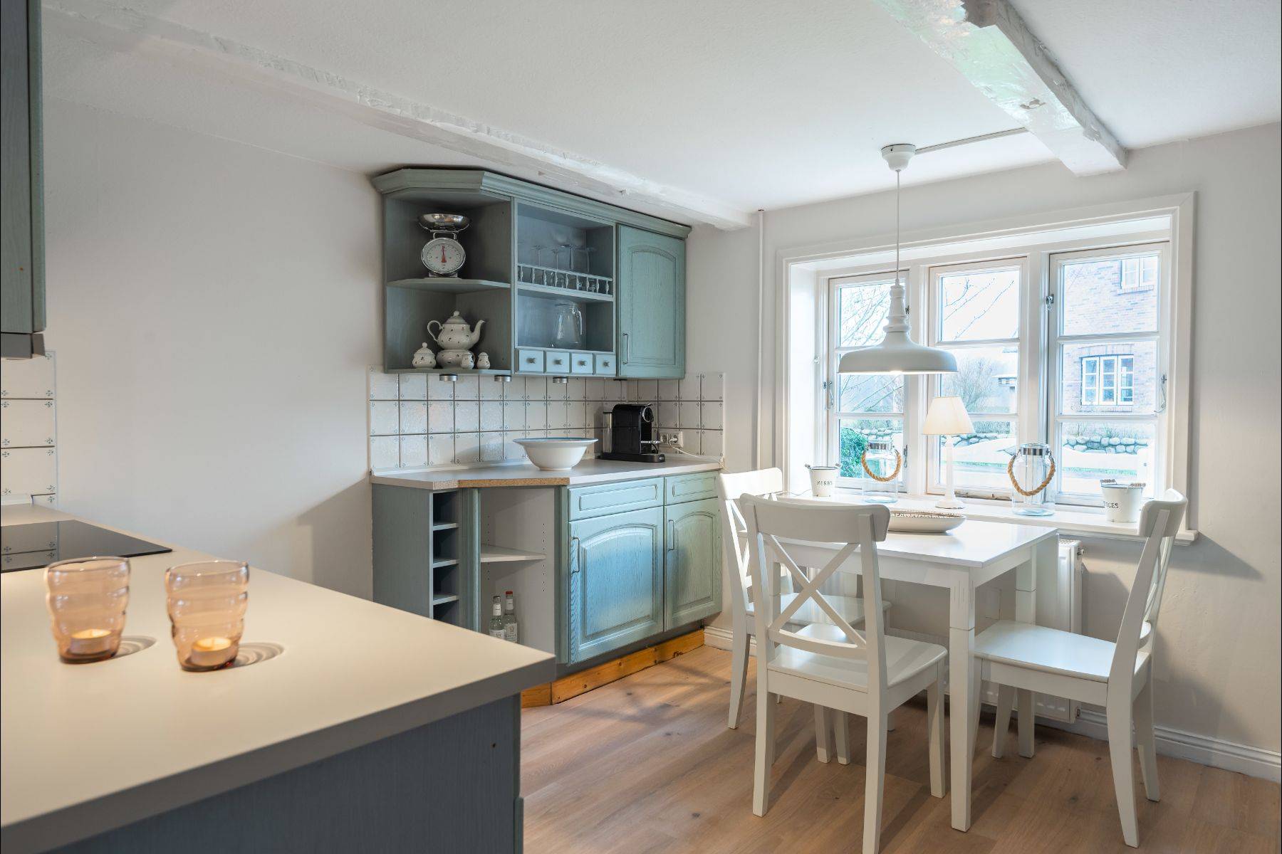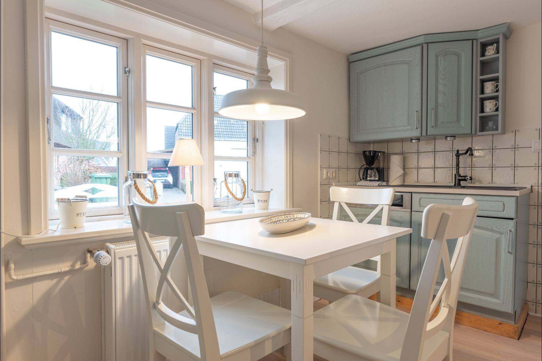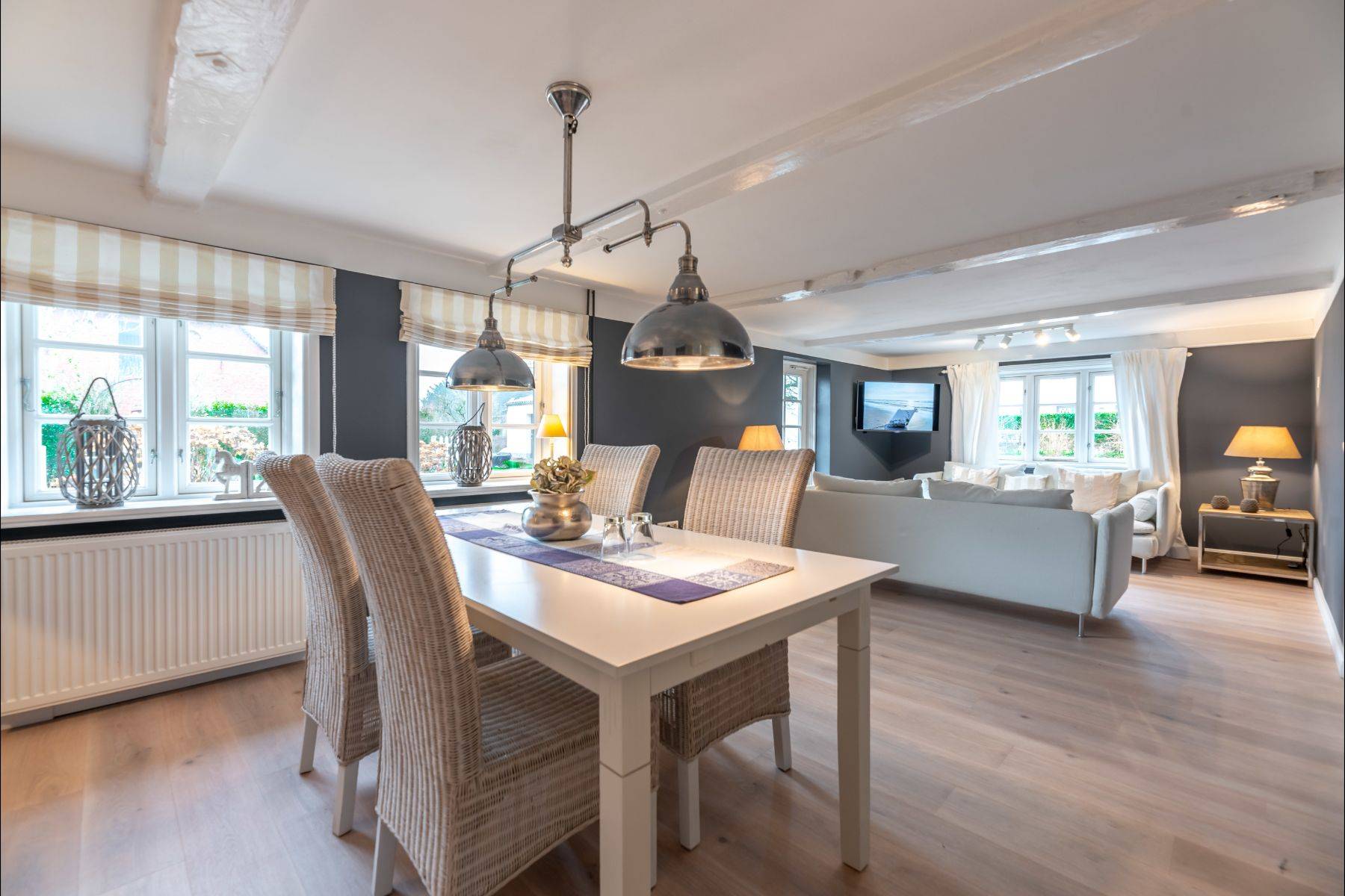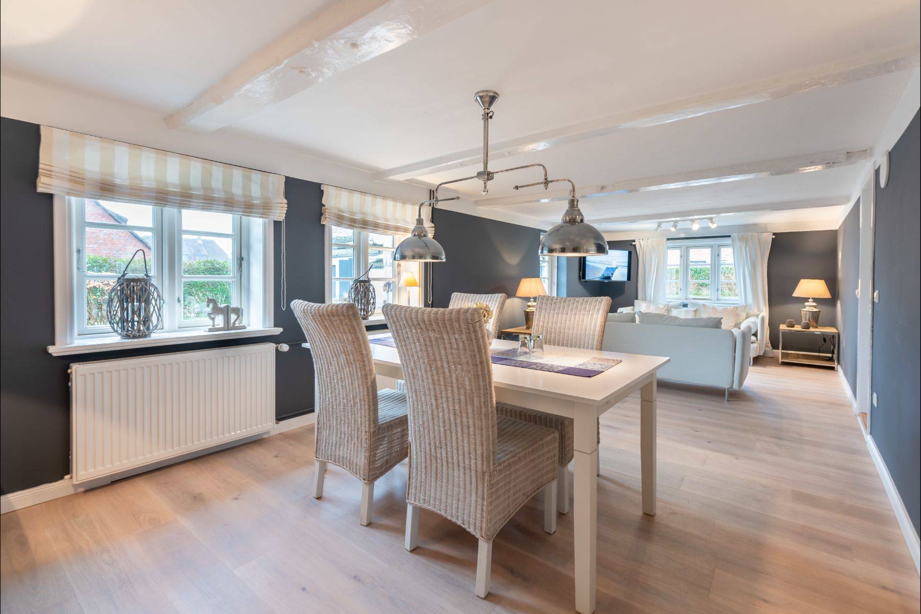 In diesem gemütlich, im nordischen Landhausstil eingerichteten Friesenhaus (ca. 75 qm), steht Ihnen ein heller geräumiger Wohn- und Essbereich mit angegliederter Küche zur Verfügung.