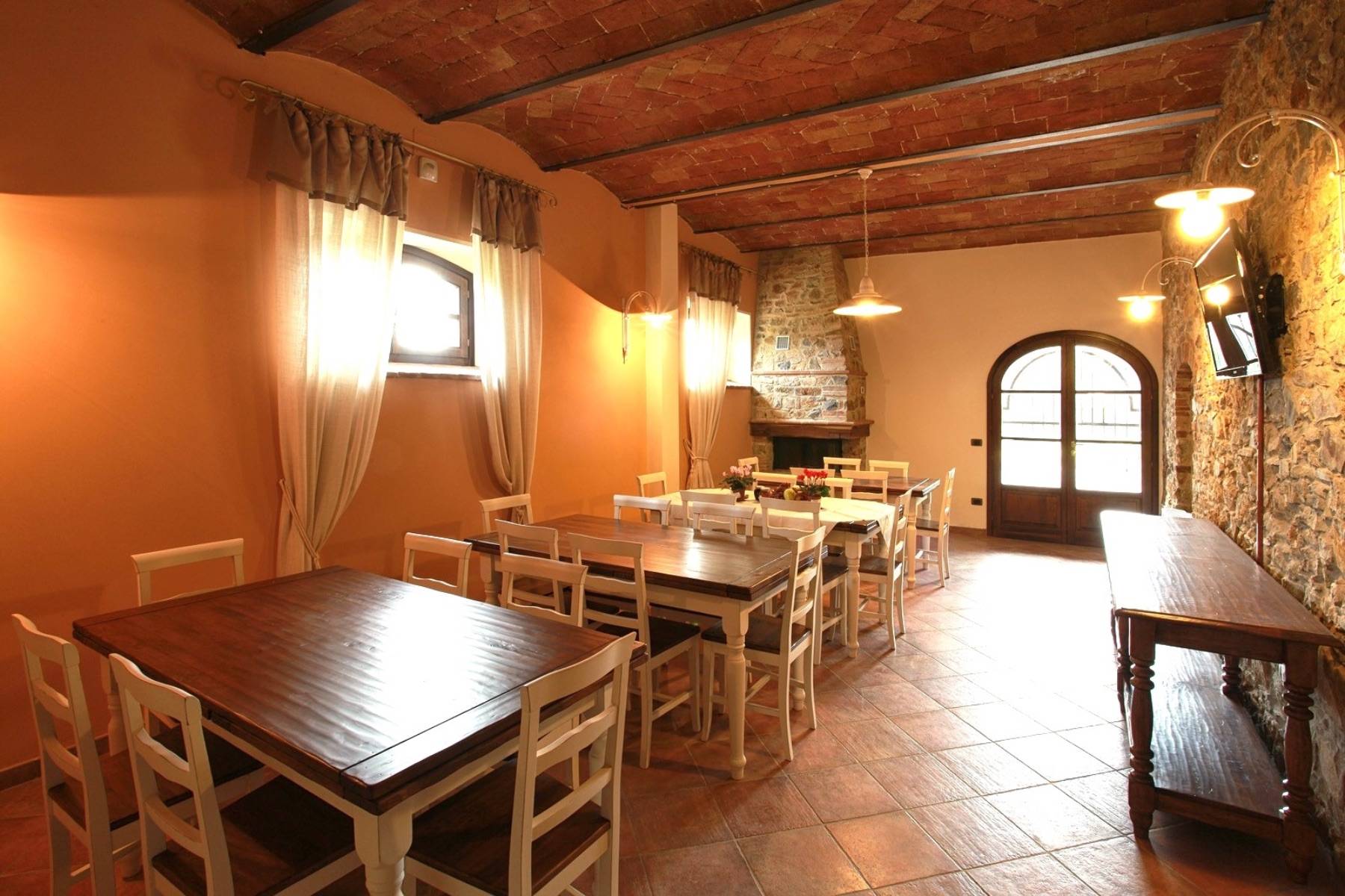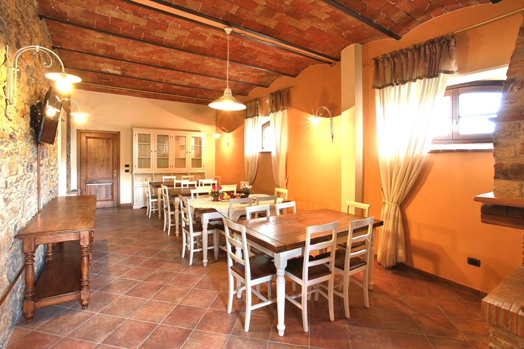 Viel Platz bietet auch der weitläufige Essbereich mit Kamin, Gewölbedecke und der integrierten Küche, die bestens ausgestattet ist.