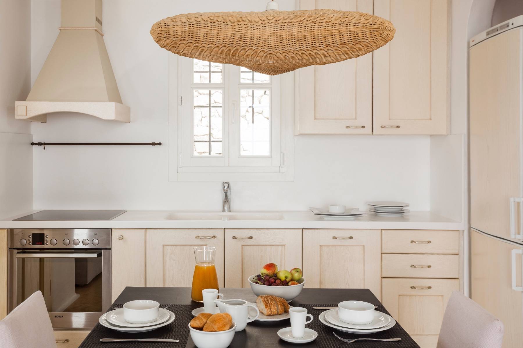 Im Erdgeschoss verfügt das Luxusgebäude über ein großes, klimatisiertes Schlafzimmer, ein eigenes Marmorbad mit Waschbecken, Dusche und WC, eine private Terrasse, eine Küchenzeile und ein zusätzliches Wohn- und Esszimmer. Die weiß getünchten Wände schaffen eine frische und beruhigende Atmosphäre und die sehr ästhetischen Dekorationen spiegeln den eleganten Geist wider, für den die Insel bekannt ist.